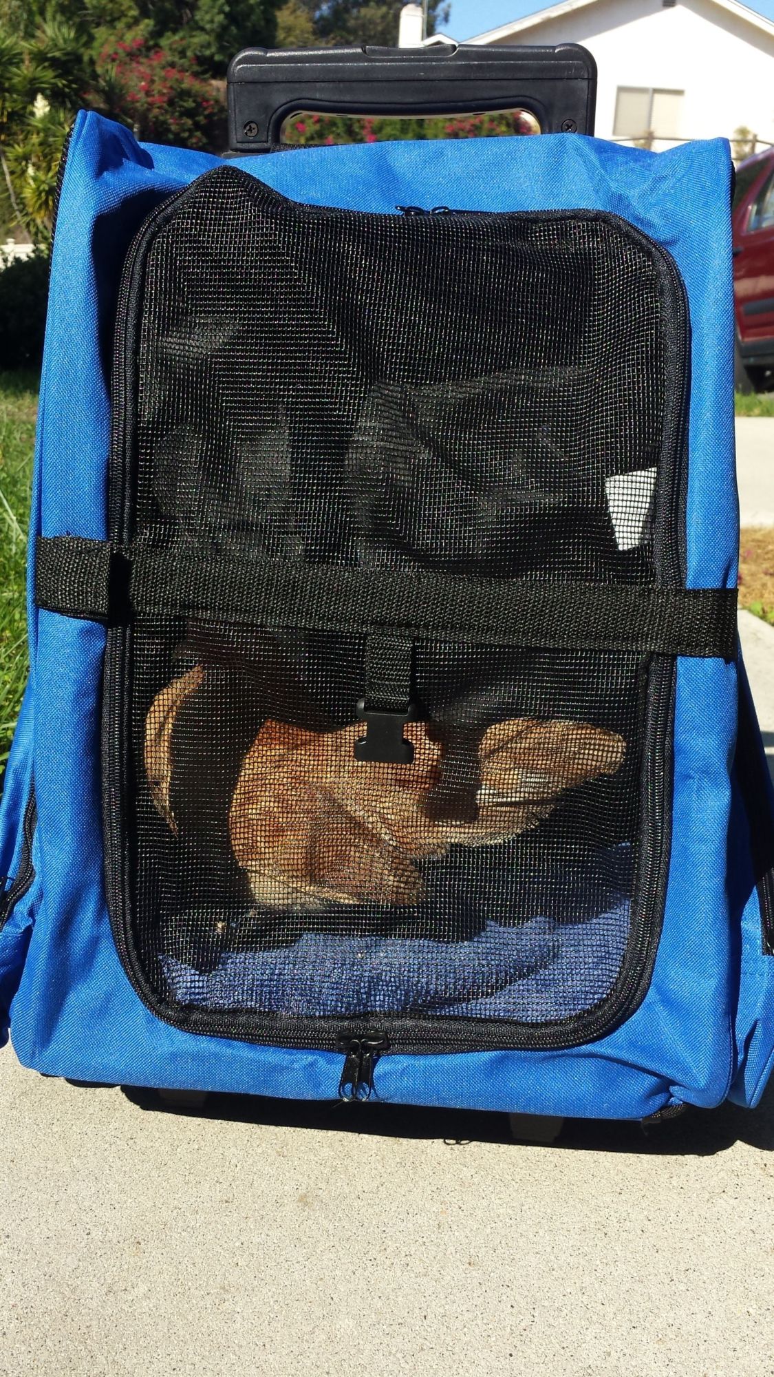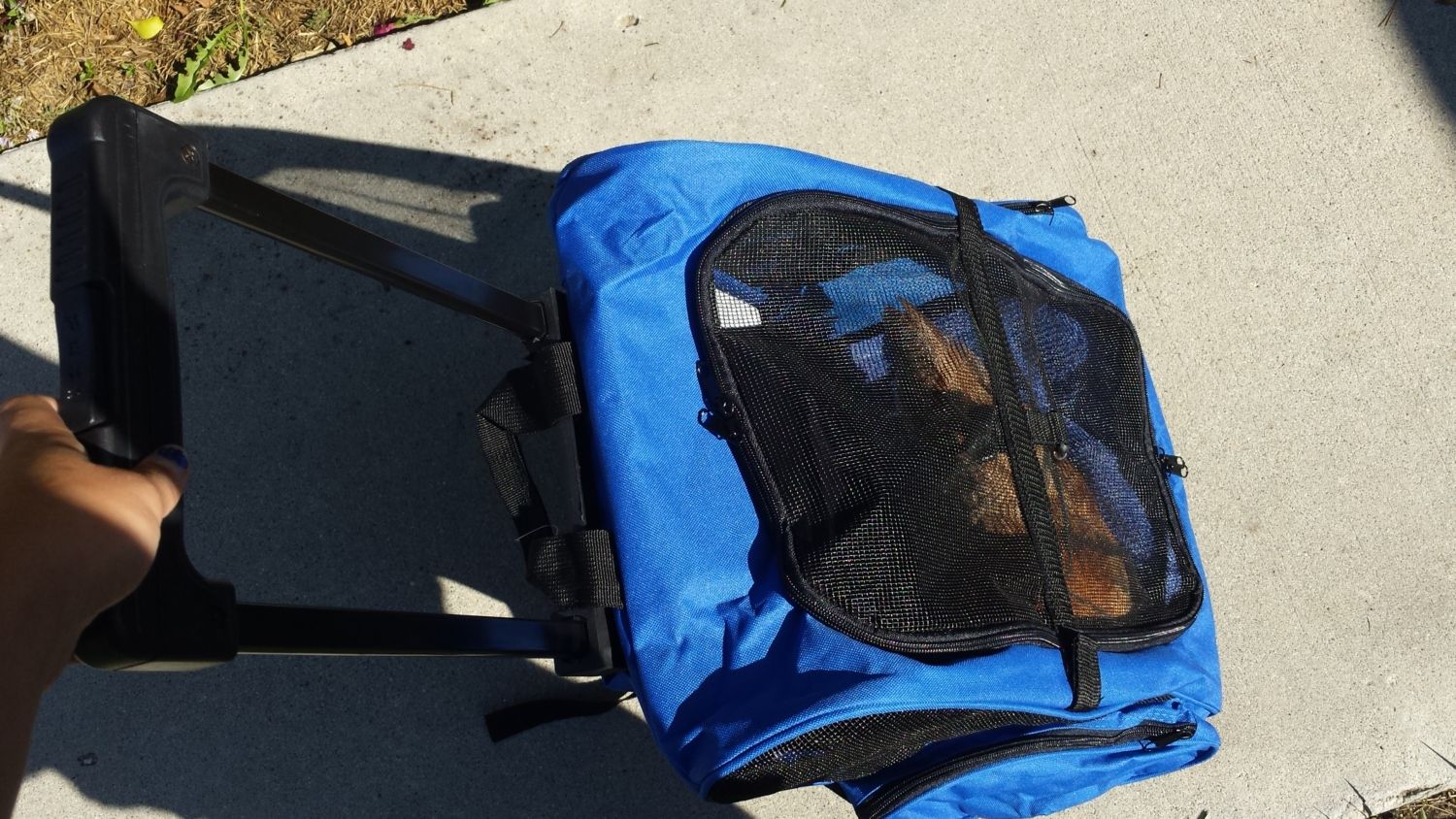 I started out with a diaper with a leash from MyPetChicken.com for about $25. Then I saw someone with a small mesh dog carrier, and I said to my self "What if I had that for my little serama Penny". I did my researching and found one but I could not buy it Than I looked else where and found the perfect one! It is called a "OxGord Rolling Backpack Pet Carrier" I found it on amazon for only about $25 or $30! So I ordered it and it said it would come like the 8th-14th but... IT CAME A DAY EARLY!!!! I was so excited! When I opened it only needed you to assemble 2 things only took a min to assemble Super Easy. It also has a few extra features like a atached leash, 2 pockets, a roll down top and it can turn into a backpack or a rolling carrier. Here are some pics when we were going for a walk.(Cause it was not a safe site to buy from)