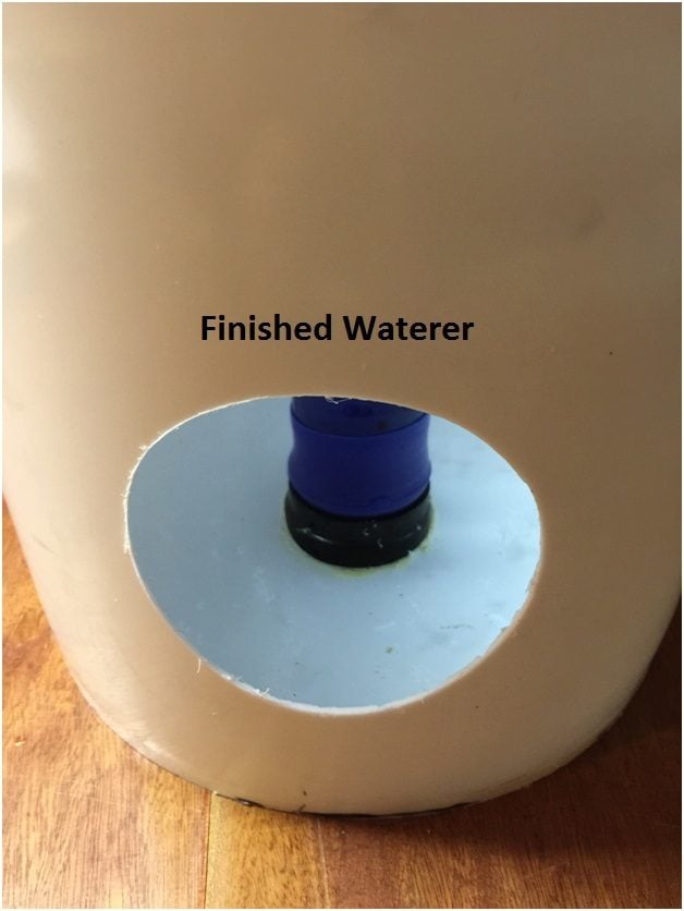 Plastic 5 gallon Water Bottle with Horizontal Nipples on Cookie Tin Heater