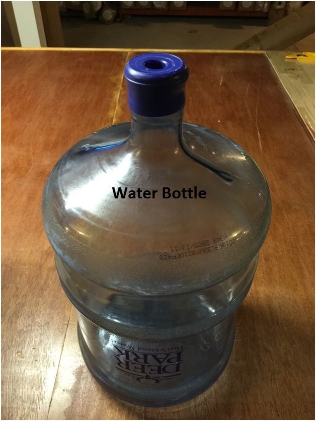 The water bottle sits on top of the tube acting as a spacer, keeping the water bottle off the bottom of the pail. The water bottle has a small opening. Once inverted, it takes a few seconds to fill the bottom of the pail, more than sufficient time to avoid any spillage.