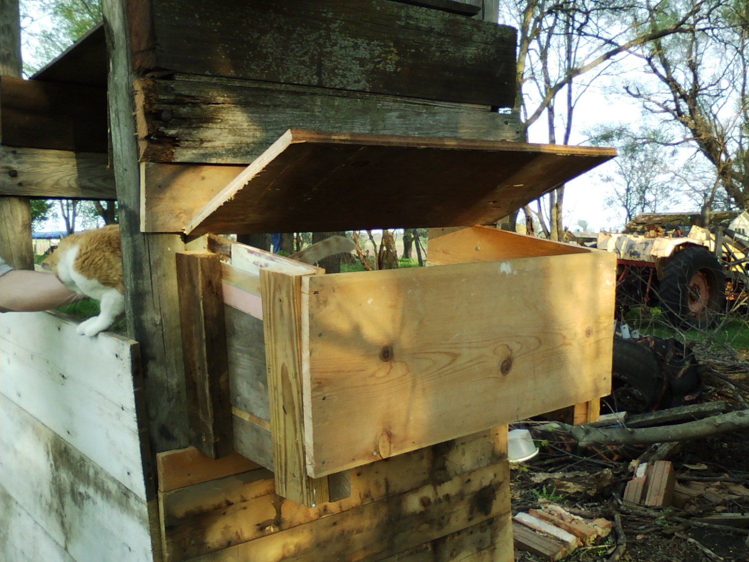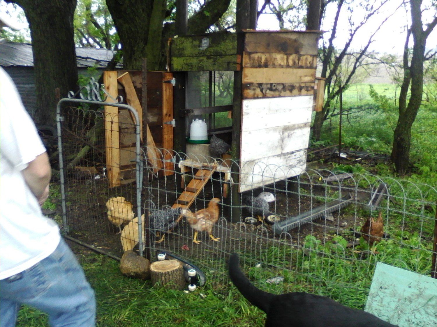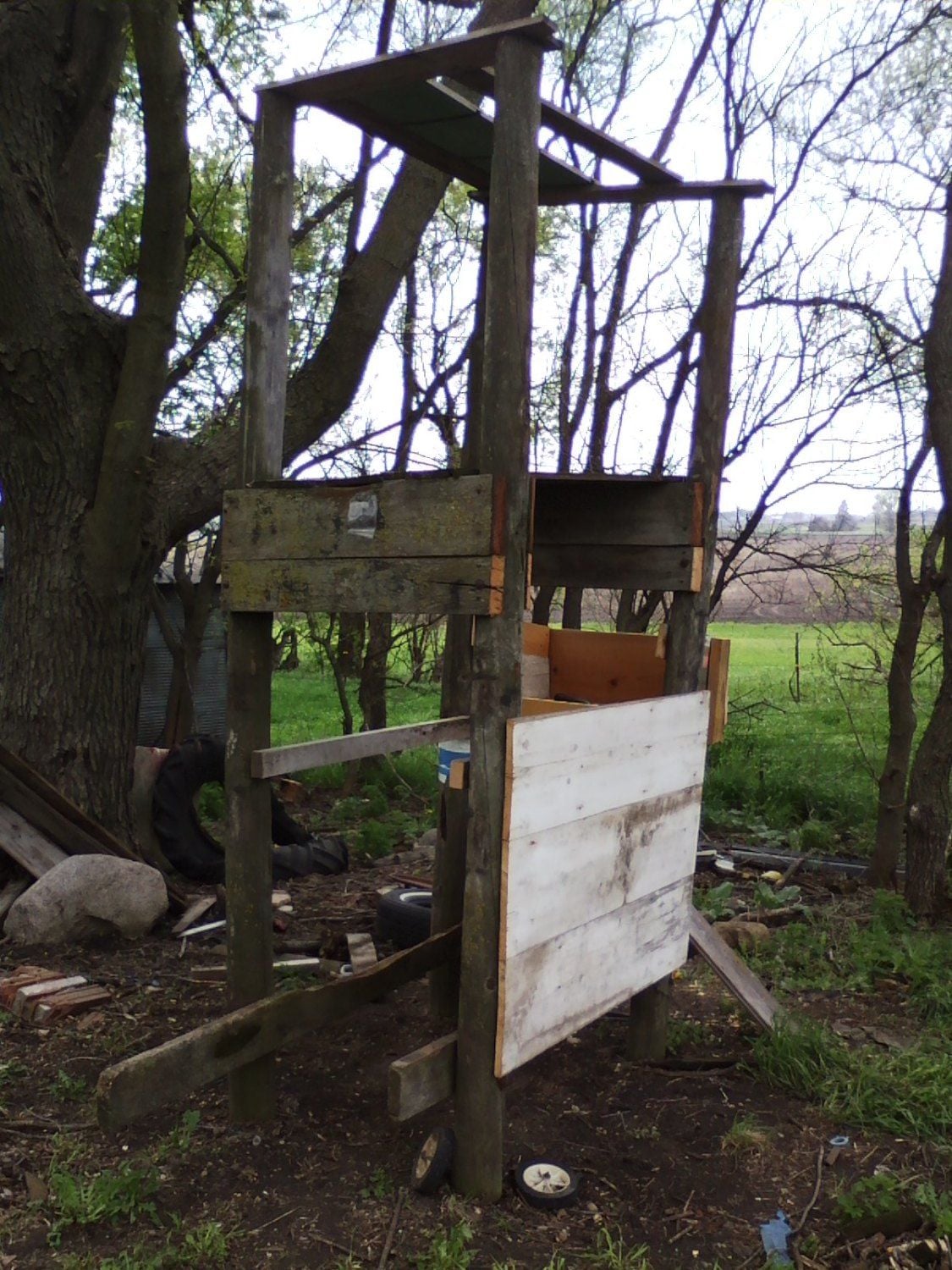 So our chicken house was built with the intent on 4-6 birds living in it. My children got free "roosters" for 4-H My younger son thought he also needed some so we bought 4 hens for him, hoping that after the fair the rooster would be gone. Well somebody made a miske and we ended up with 14 hens. We didn't have a lot of money so we just threw some wood and a window on this old fuel barrel stand we had. It worked out well for the summer as they only spend the night in it and free range during the day. Now our 14 chickens are getting a new home for the winter, we are revamping the current old chicken house on our property.