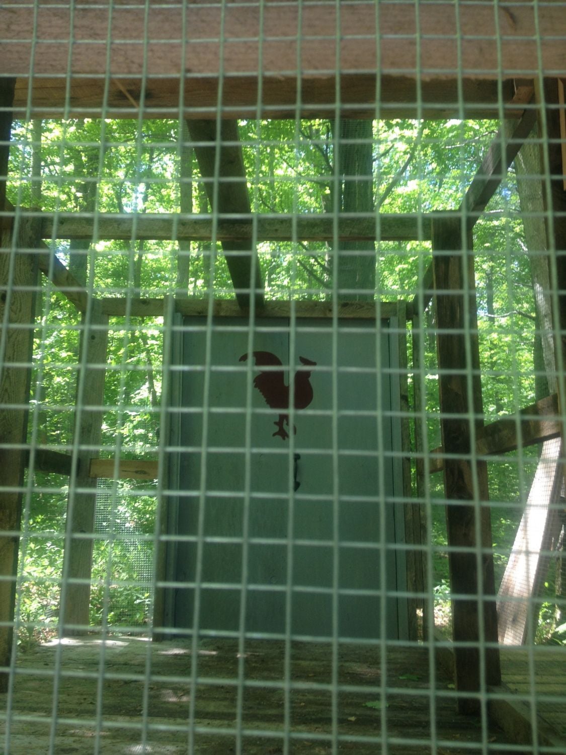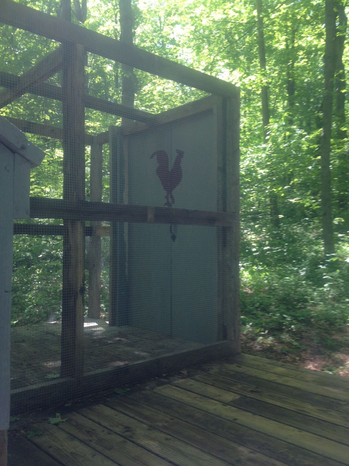 A rooster to watch over the girls! Double doors to make run clean out easier. Need to install outdoor roost and sandbox.
