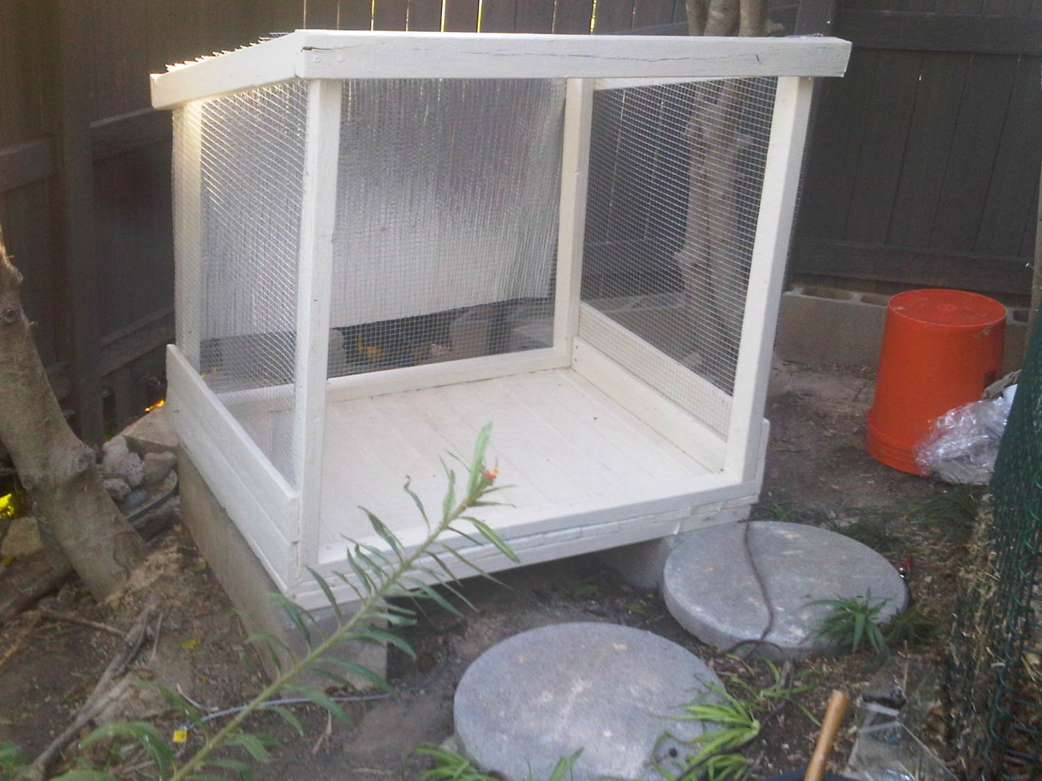 I made the frame and floor out of old stockade fence. I painted it with left over house paint. There is hardware cloth between the floor and frame.