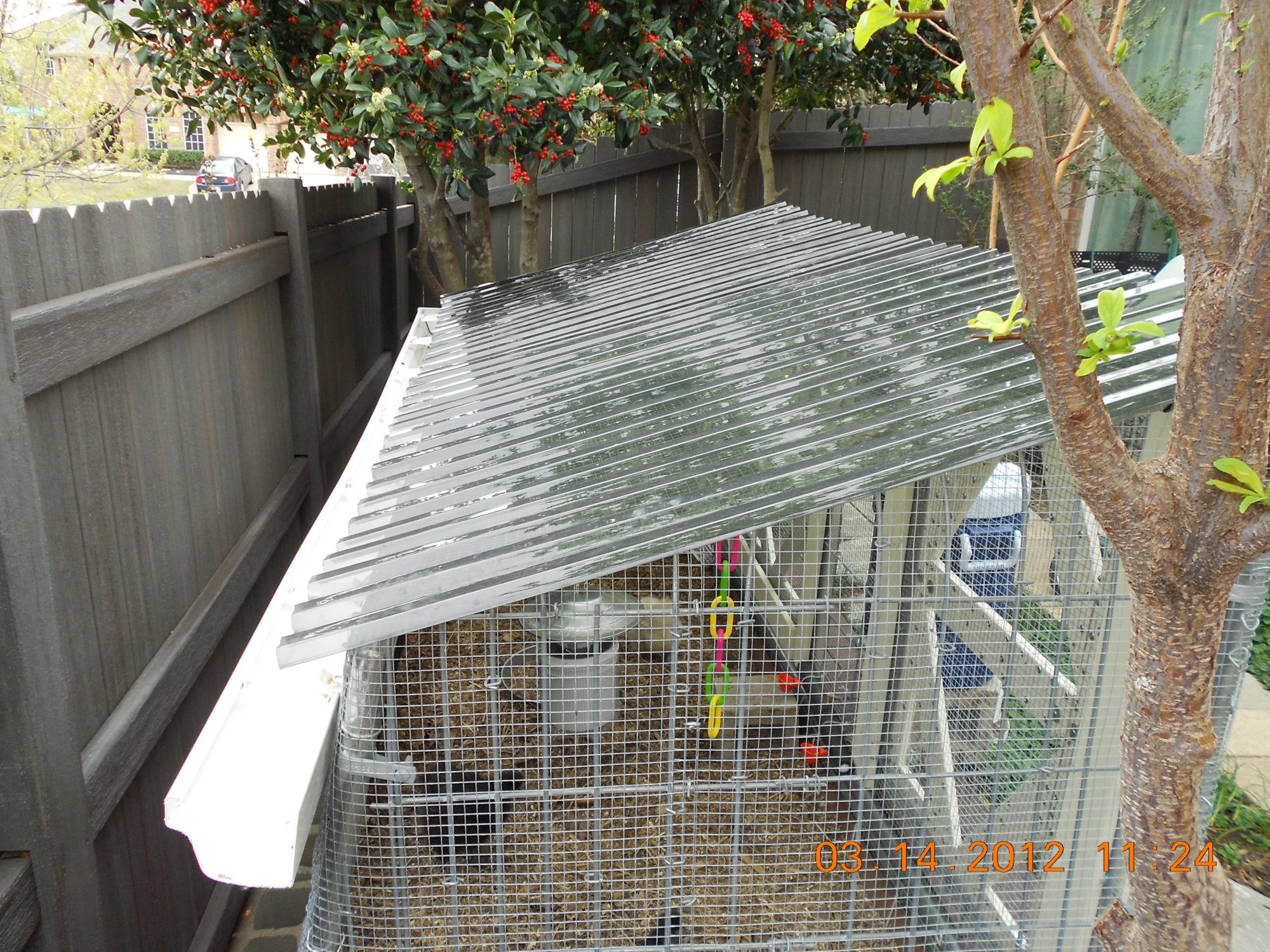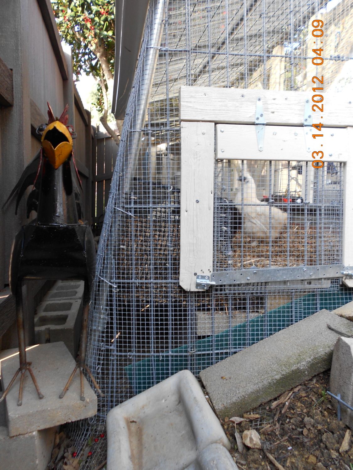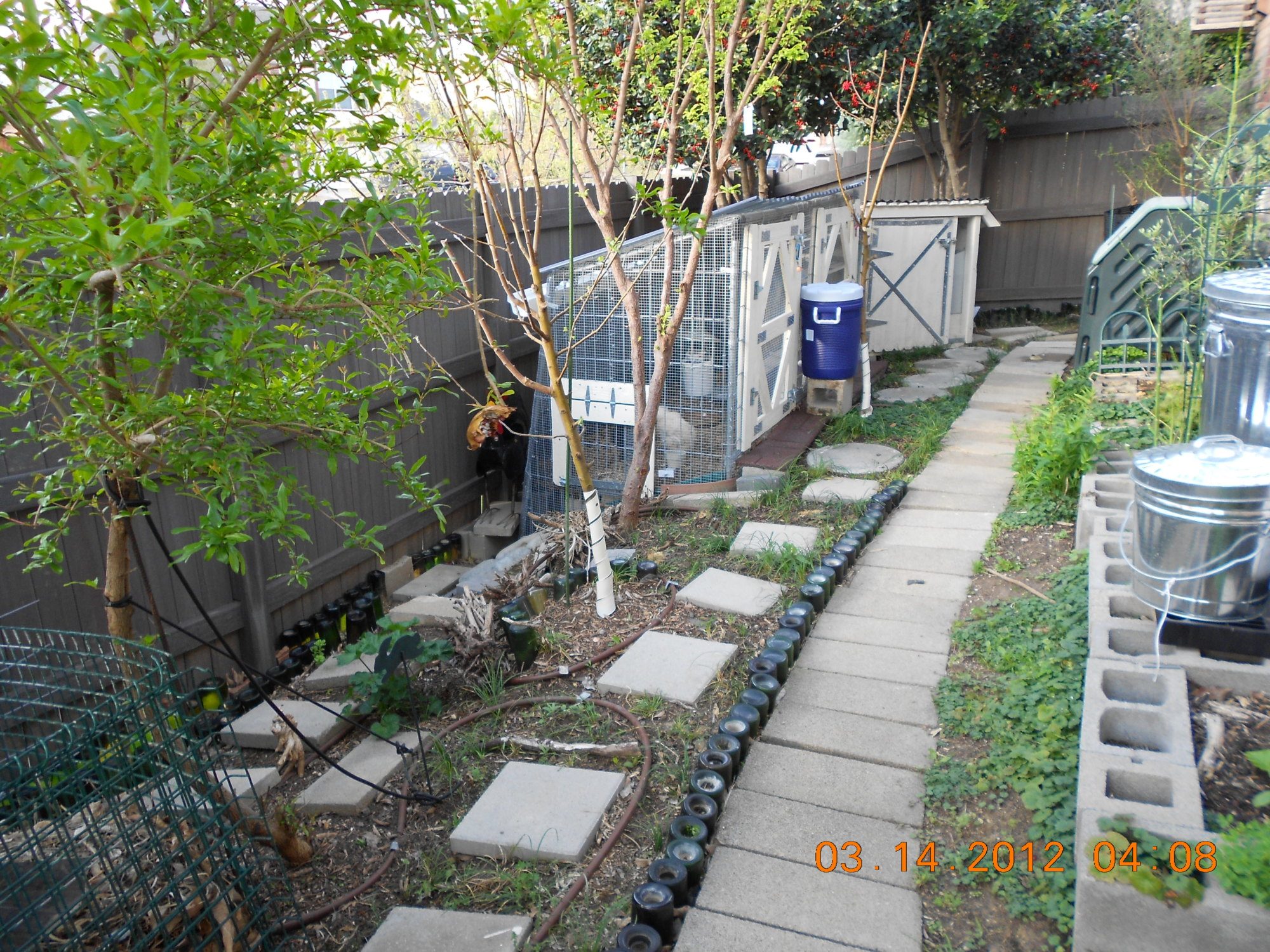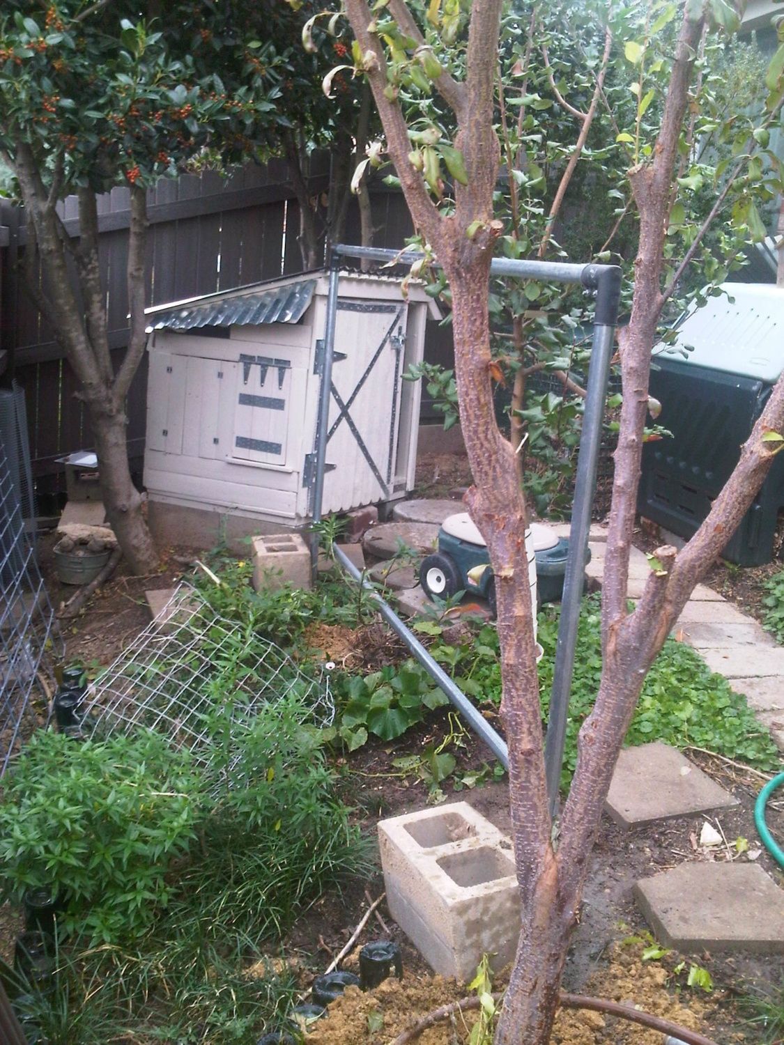 The mostly finished coop and run. I initially made all kinds of plans and drawings of how I wanted to build this coop and as it turns out I didn't follow any of them. I took a lot of advice from this website. I let the yard decide how big to build it. It had to fit between various trees, walkways and fence. It had to be hidden from the street, and as rodent proof as possible. I started it October 2011 and ~finished it the end of February 2012. In the picture above; the coop has the solid door and is situated under two large holly bushes. The run is the larger structure with 2 open frame doors. The dark green structure to the right of the picture is a compost bin. The metal trash cans store food and bedding. The bin in the lower left corner contains yard waste that can be used as bedding (chipper/shredded trees). There are 2 apple, 1 pomegranate and 1 plum tree in this picture as well.