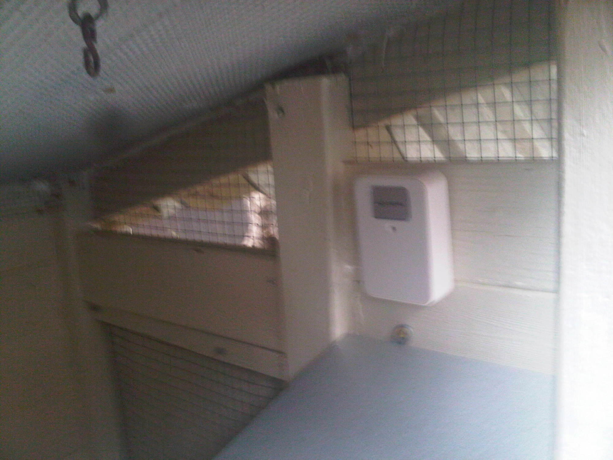The inside right wall of the coop. Showing ventilation. The white box in a thermometer that transmits the coop temp and humidity to a monitor in my house.