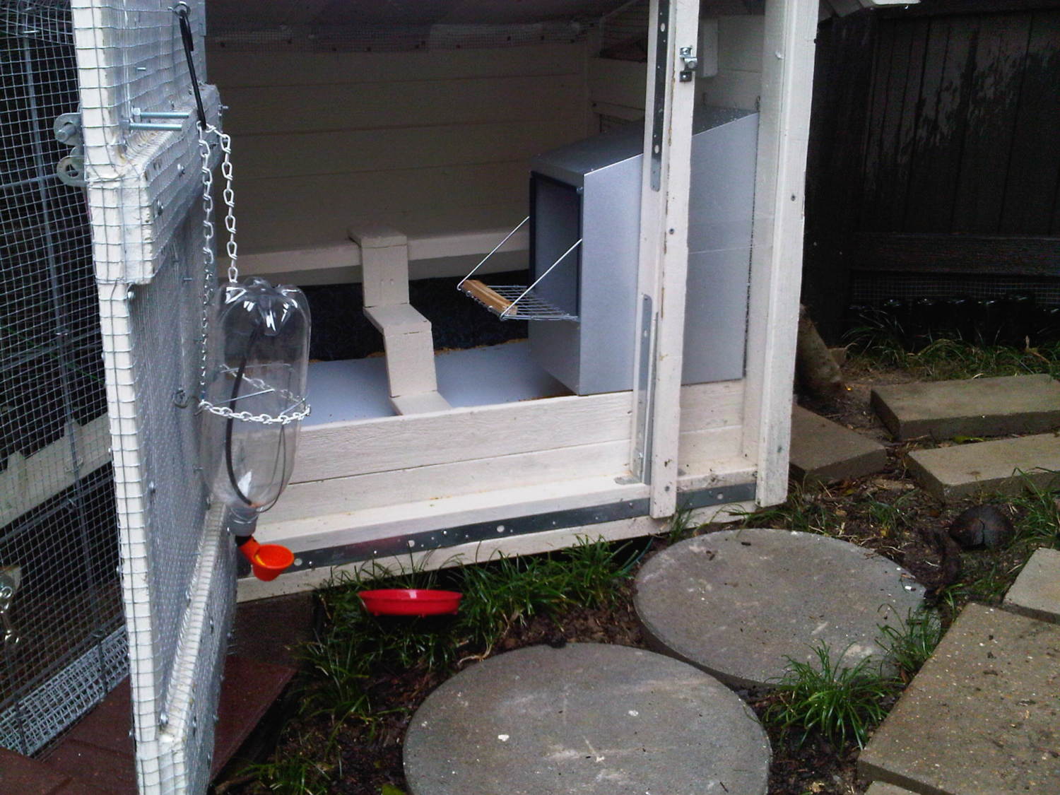 open front door to the coop. Using a beak-time waterer inside while I get the birds acclimated. (I thought it leaked but after using a week I've decided it really doesn't leak) The roost is in the back with a "chicken staircase leading up to it and hooked over the back. I put a vinyl floor over the painted wood and a rubber barn mat over that. The boards in the front hold the bedding in and are removable. The stairs, roost and nest box are also removable.