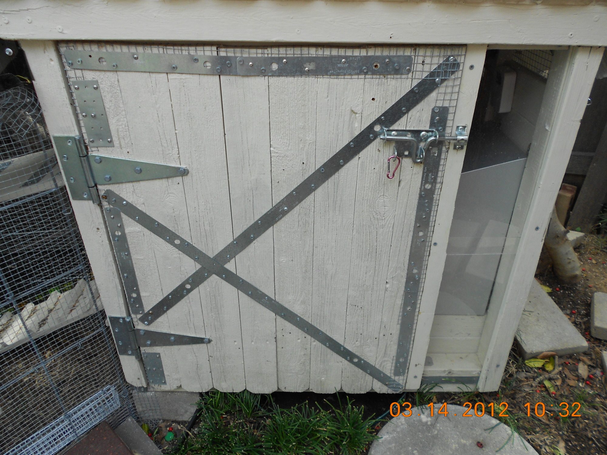 Front door to coop. I put hardware cloth on the back and sides to keep rodents out. I secured the hardware cloth with metal plates. I also wedged metal plates in the gaps on the hinge side of the door to keep out rodents. I put plexi-glass on the right to be able to look in before opening the door.