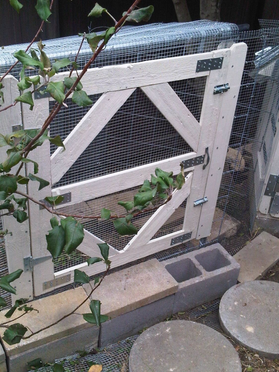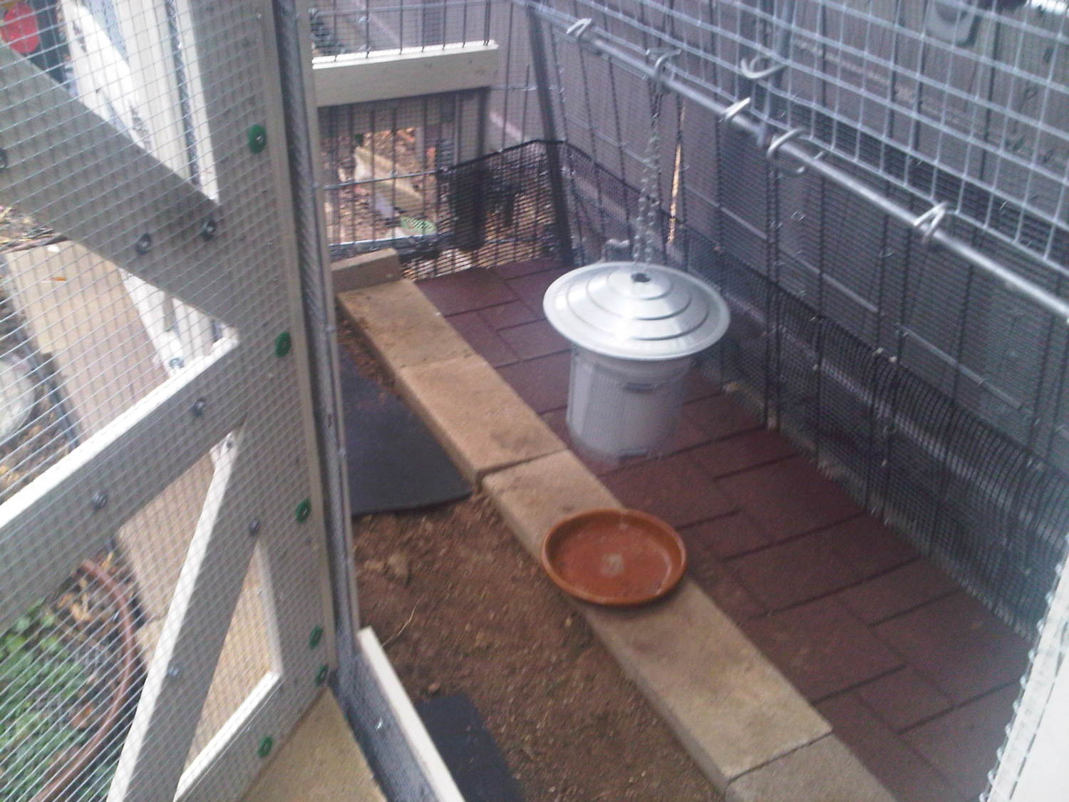 chicken run. I used cyclone fence rail for the frame. The back poles closest to the fence are slanted in to provide space between the fence so I can get back there. This part of my side yard is very sloped and uneven. I kinda terraced it with cinder blocks. I put hardware cloth over cattle panel for the walls. I put hardware cloth ~ 12 inches on either side to thwart digging in or out. I used cyclone fence parts from Lowe's to attach cattle panel to the cyclone fence and hog rings from Home Depot to attach hardware cloth to cattle panel.