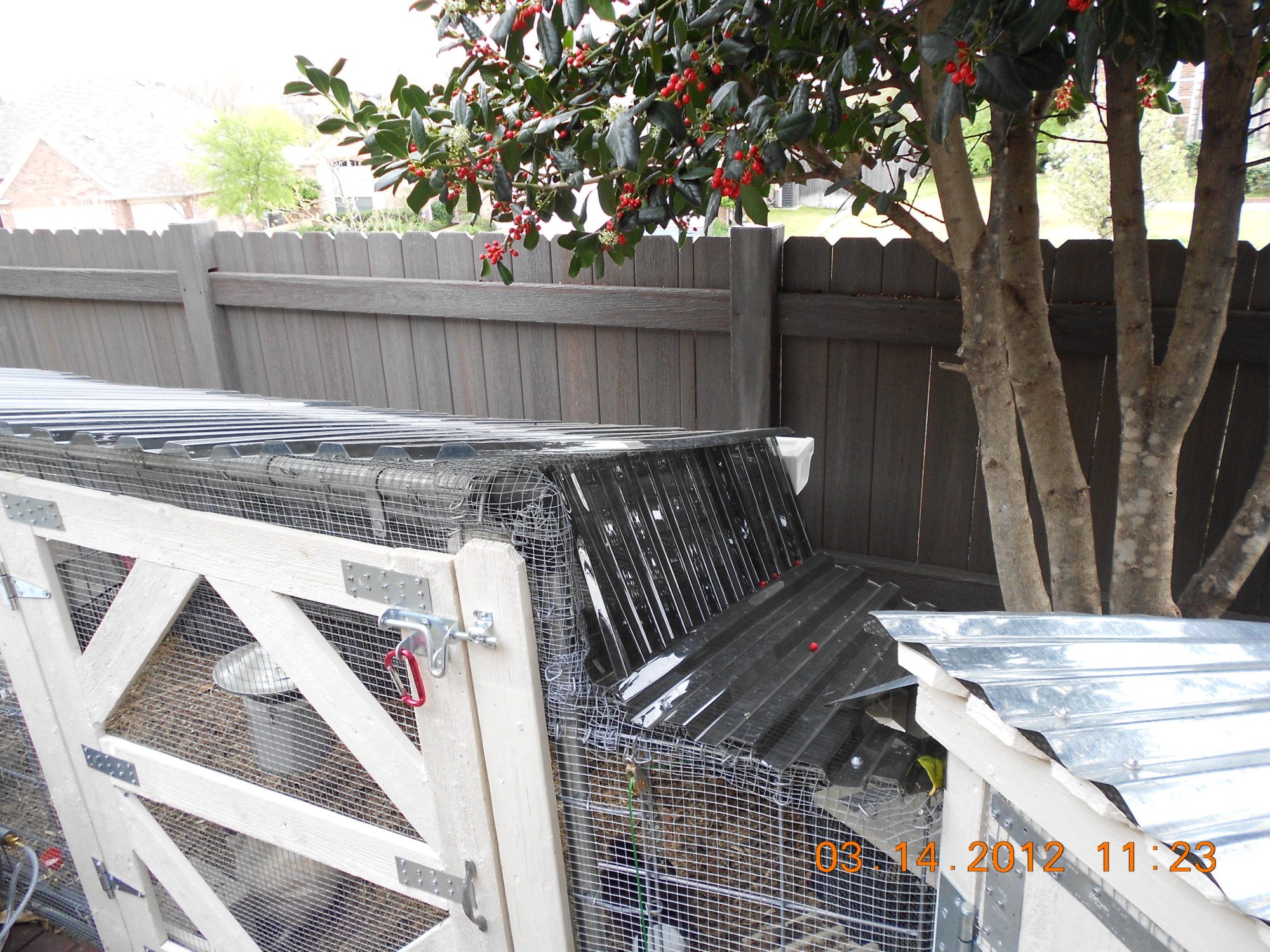 Roof transition area between coop and run. This has worked well.