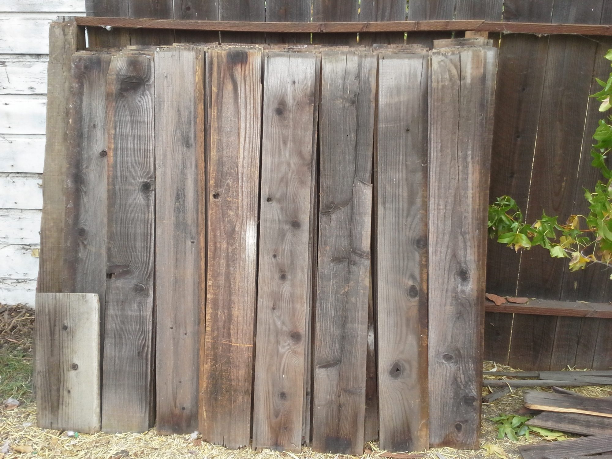 Piles of reclaimed wood from fencing demolition. Much was rotted and had to be tossed unfortunately.