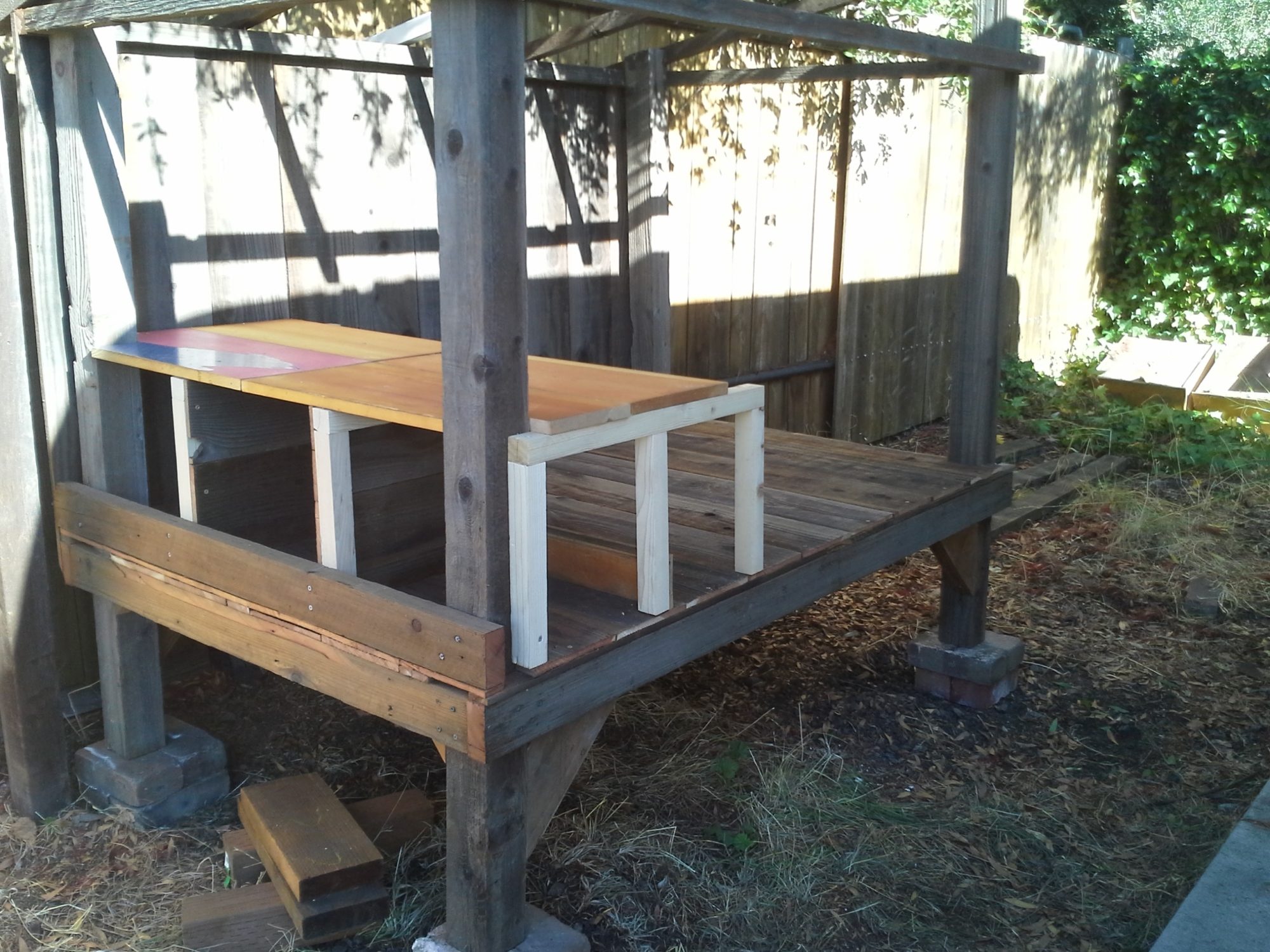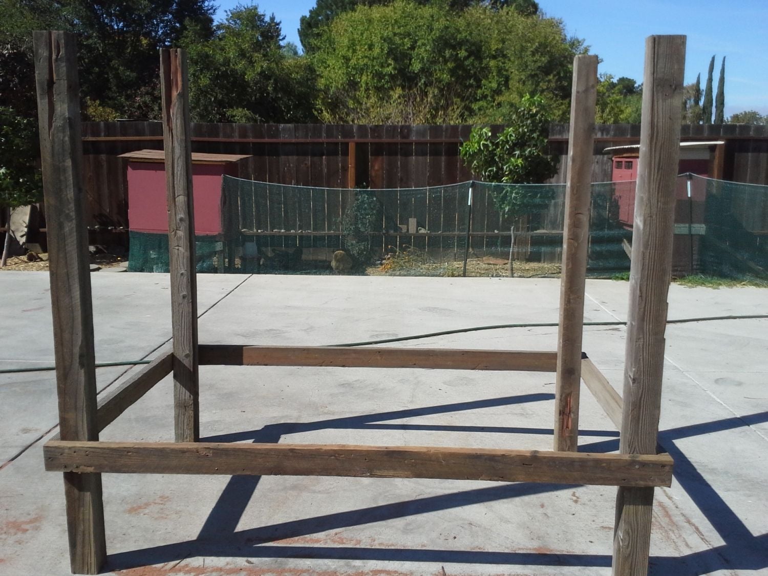 Initial framing of the basic design is completed. Old red cabinet coops and my girls in the background watching the building.