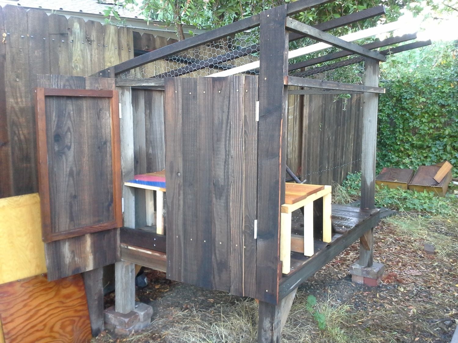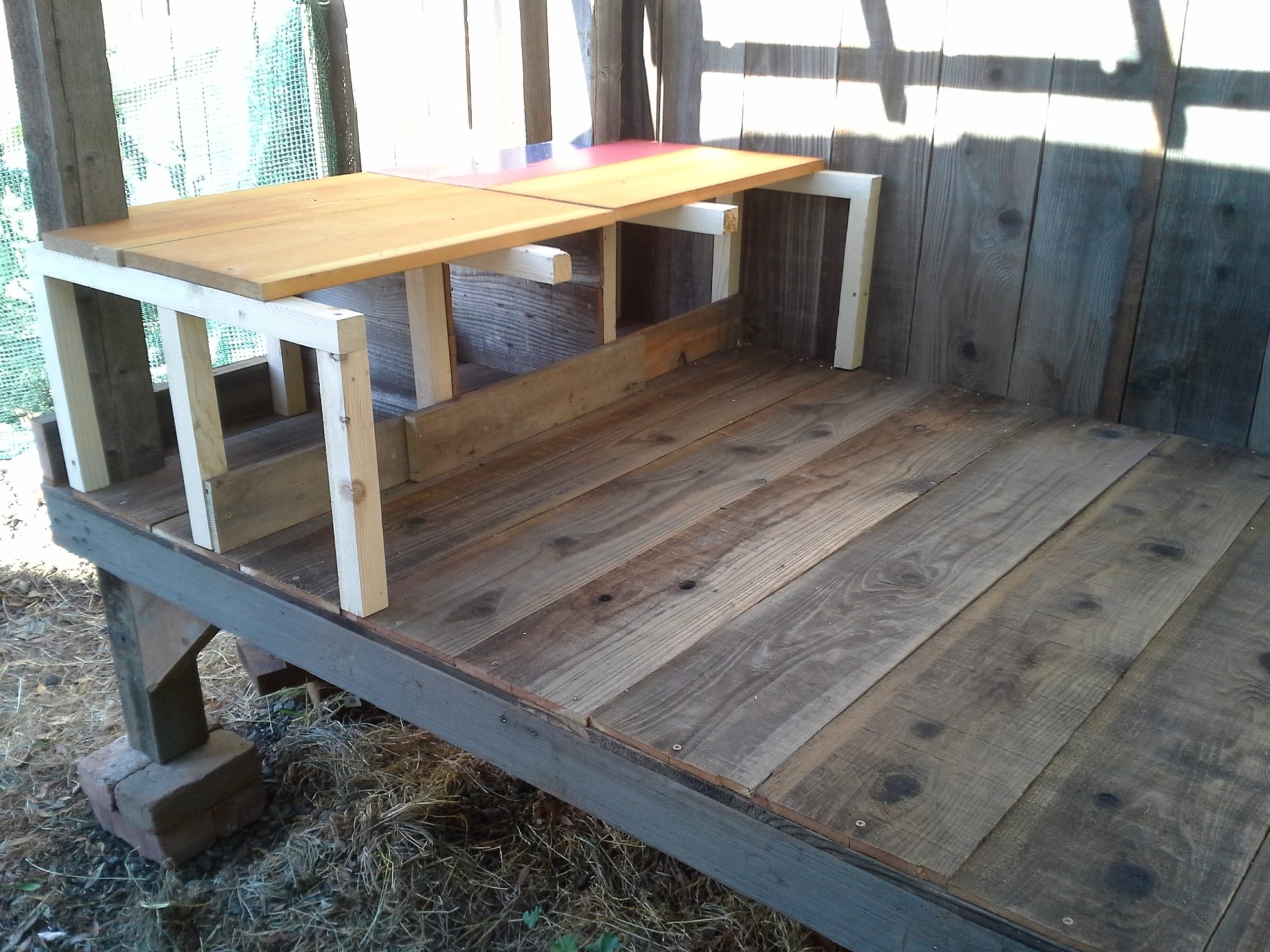 Internal next boxes framed in. I found some left over shelving from the old kitchen cabinets to use as a 2nd floor kitchen area. This is where my girls will come for food and water. Planning to build doors to access both the kitchen and nesting areas from the outside. Now I just need to learn how to build doors out of old recycled fence materials.