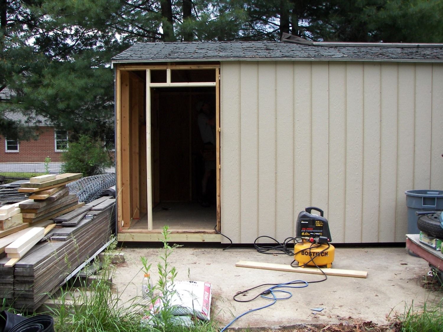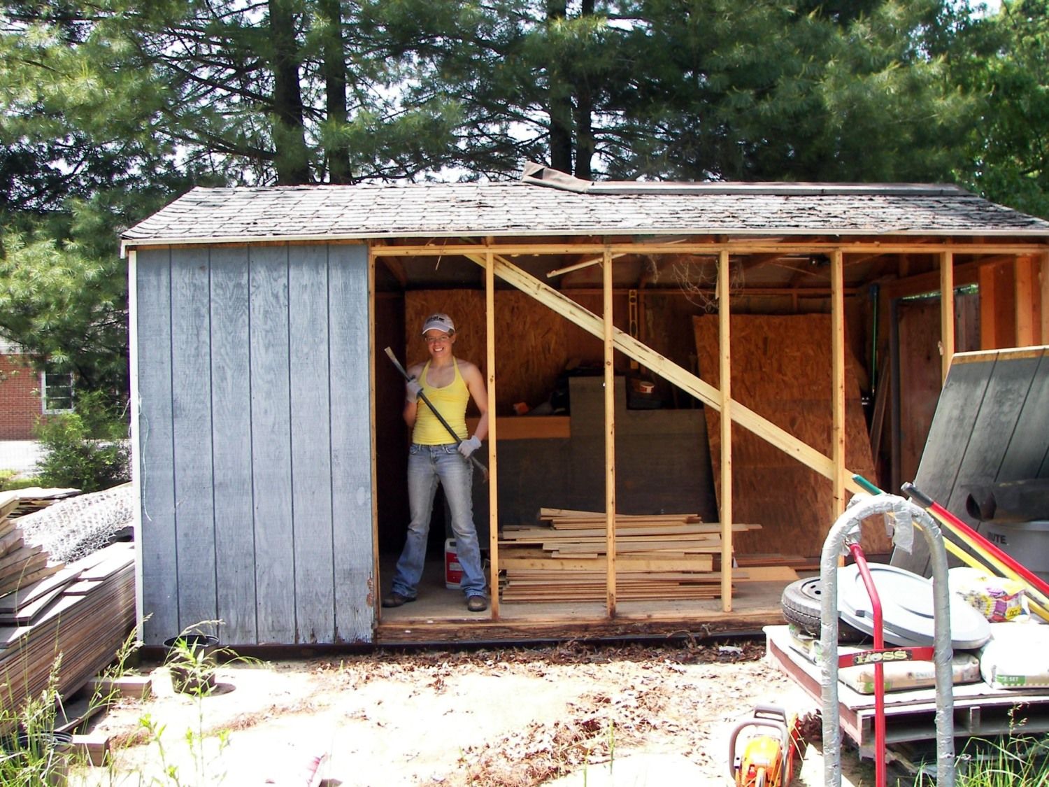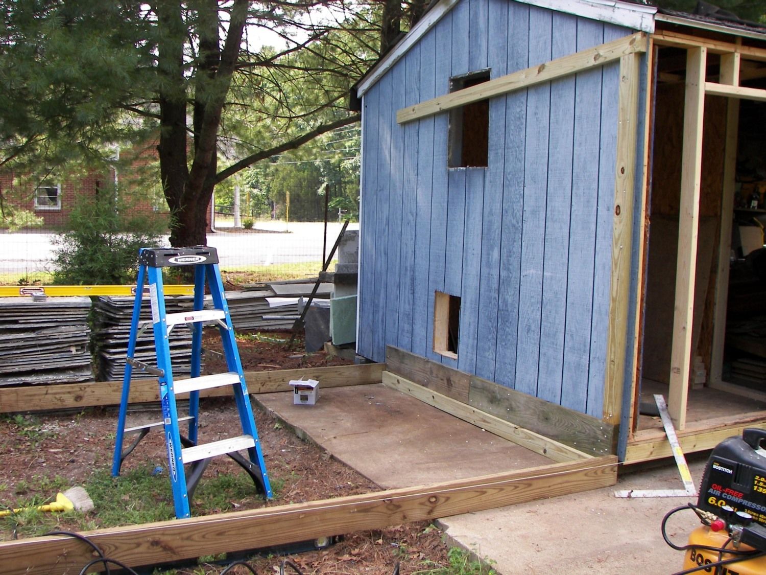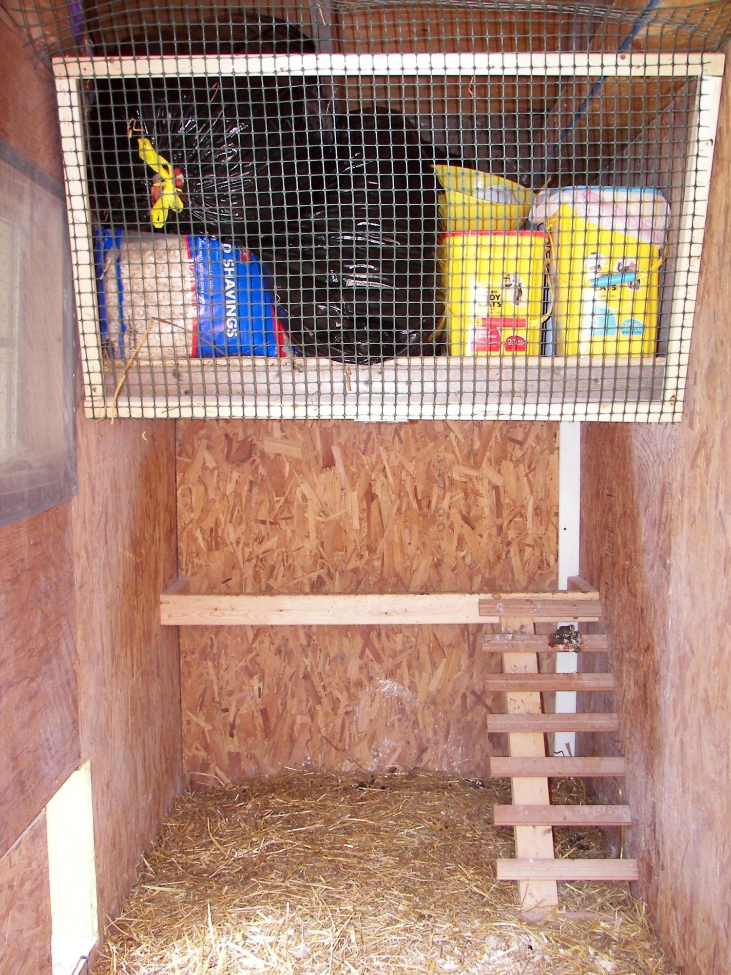 This is an old shed. My husband generously donated the back 4" by 10' to my chickens. We put in a new window and a pop hole that has a simple pulley stem so you can raise and lower the door from the outside of the coop. There is an attached run that is partially covered with metal roofing. It is slanted because we plan on adding a gutter to collect rainwater into a rain barrel for summer watering.