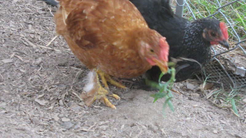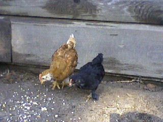 Now here is Wafers with her friend Coral Rose. Coral Rose is an EXCACT replica of her mother (the hen that was killed by the black chicken snake when she was protecting her chicks.) It is a little scarry looking over and seeing Tissi (that was her mothe