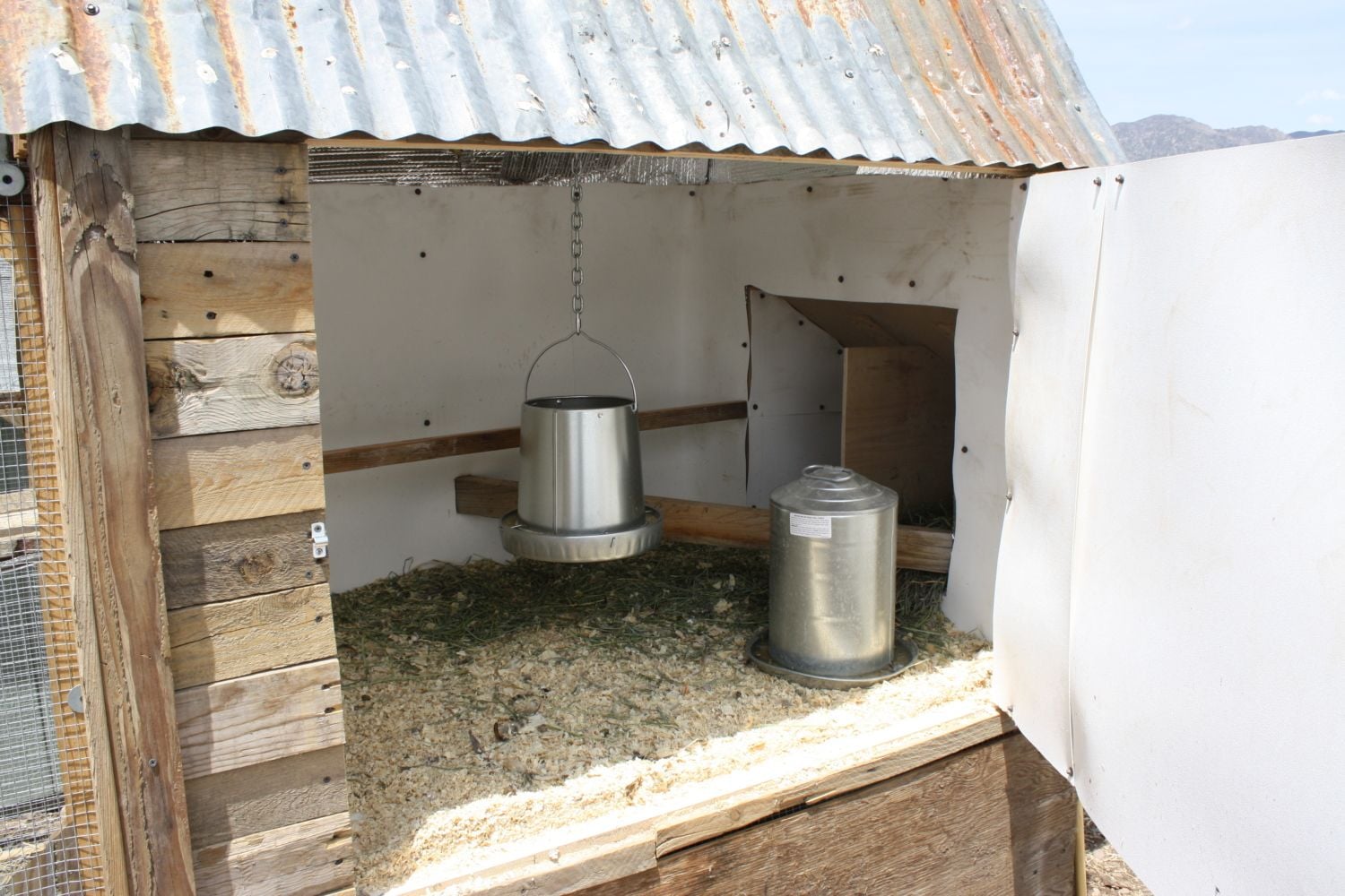 The side of the coop swings open for easy cleaning and feeding. The little window up top opens for cross ventilation when needed.