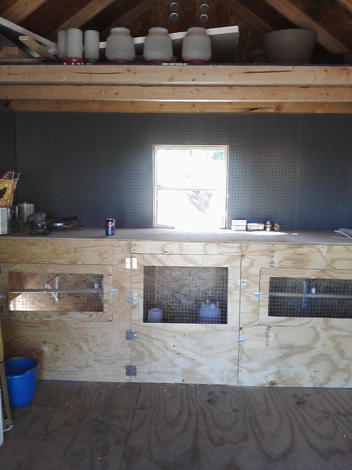 View of the coop under the workbench. Main access door in the middle is the full height of coop, the 2 side hatches were only ~18" tall. All were hinged to open outward.