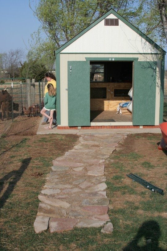 View of the front of the shed, looking back to the coop in the rear. These doors were open except in extreme weather - I made a predator-proof screen door to cover the opening yet allow access.