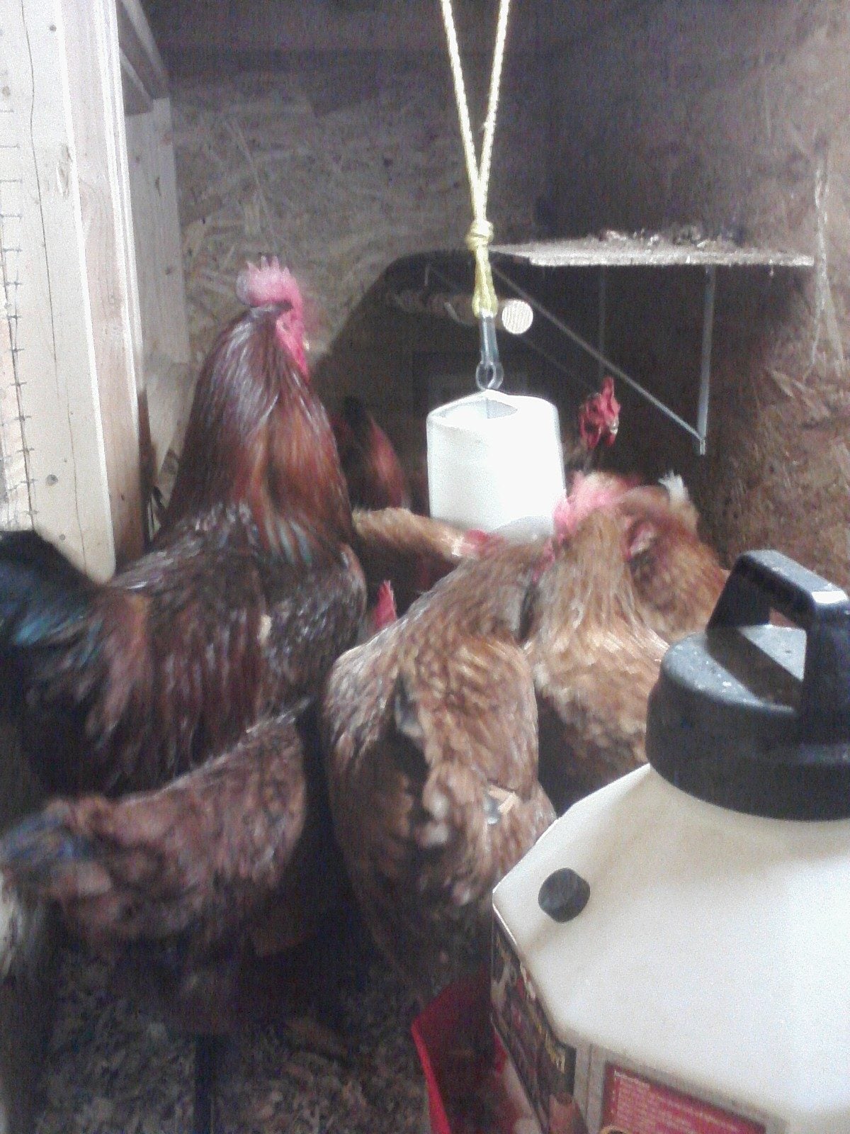 Ventilation in the coop was accomplished via the large window on the back wall, and the fact that the front doors of the shed were left open in all but the worst weather. I fashioned a predator-proof screen door to fit the opening by using a cattle panel cut to the correct dimensions, and attaching chicken wire to it. This was all held in place by 4 eye bolts and double ended snaps. I do not have a picture of the completed screen door, sorry. In the summer, I would attach a box fan to the large center door opening, to move more air.