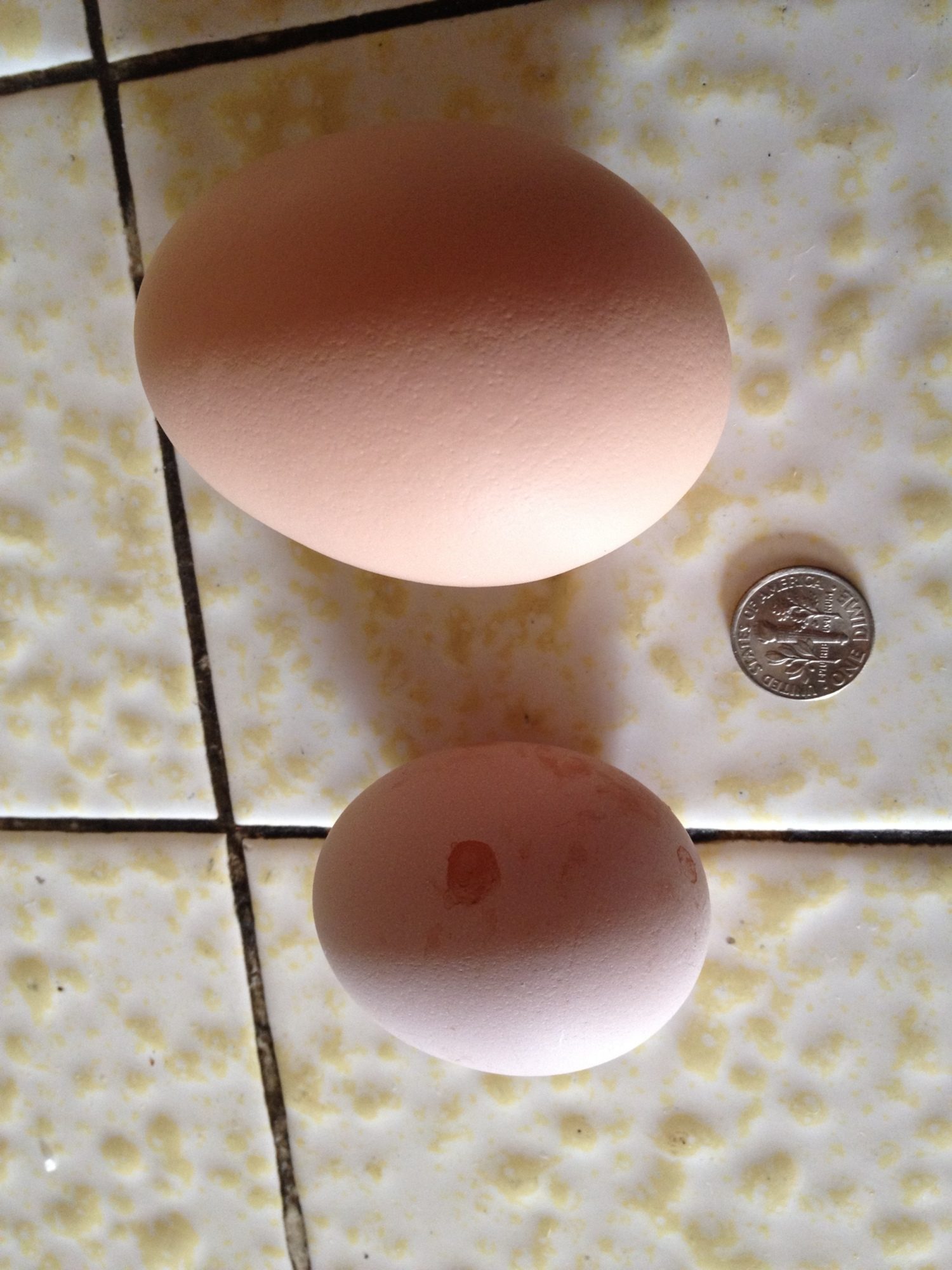 Lada Gaga's first egg on the left next to a farmer's market bought egg.