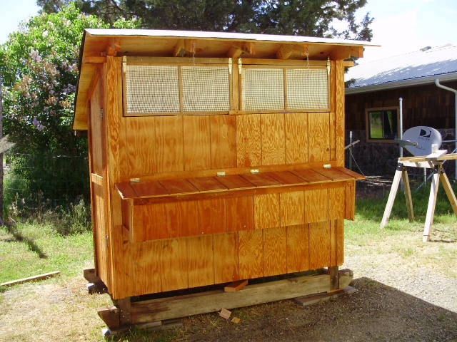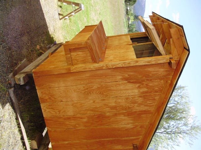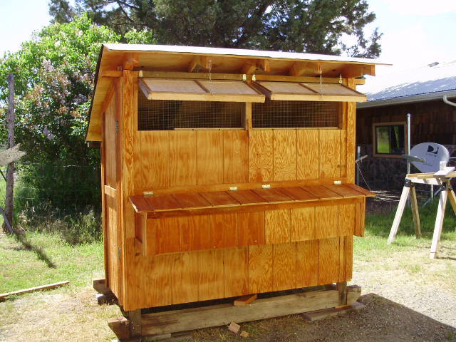 Were I to do it over I would increase the size a bit, maby 6x12 with a 3x6 storage in one end to keep feed and other items. Otherwise I kinda like the look of it and it is right handy.
