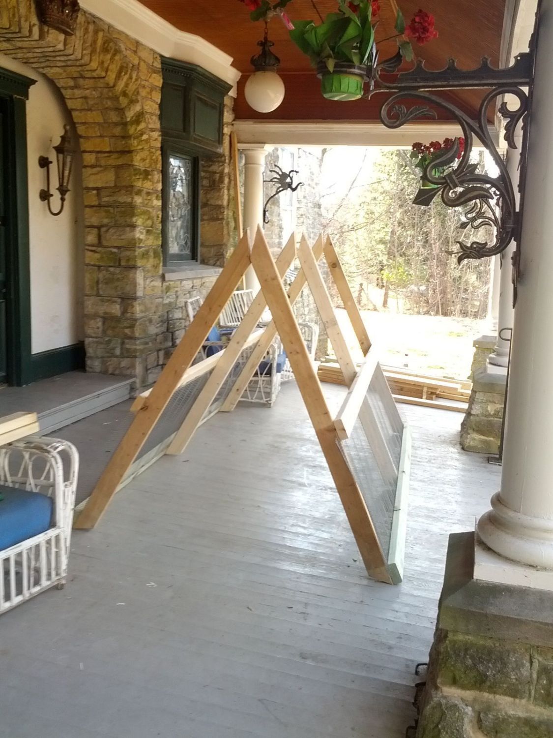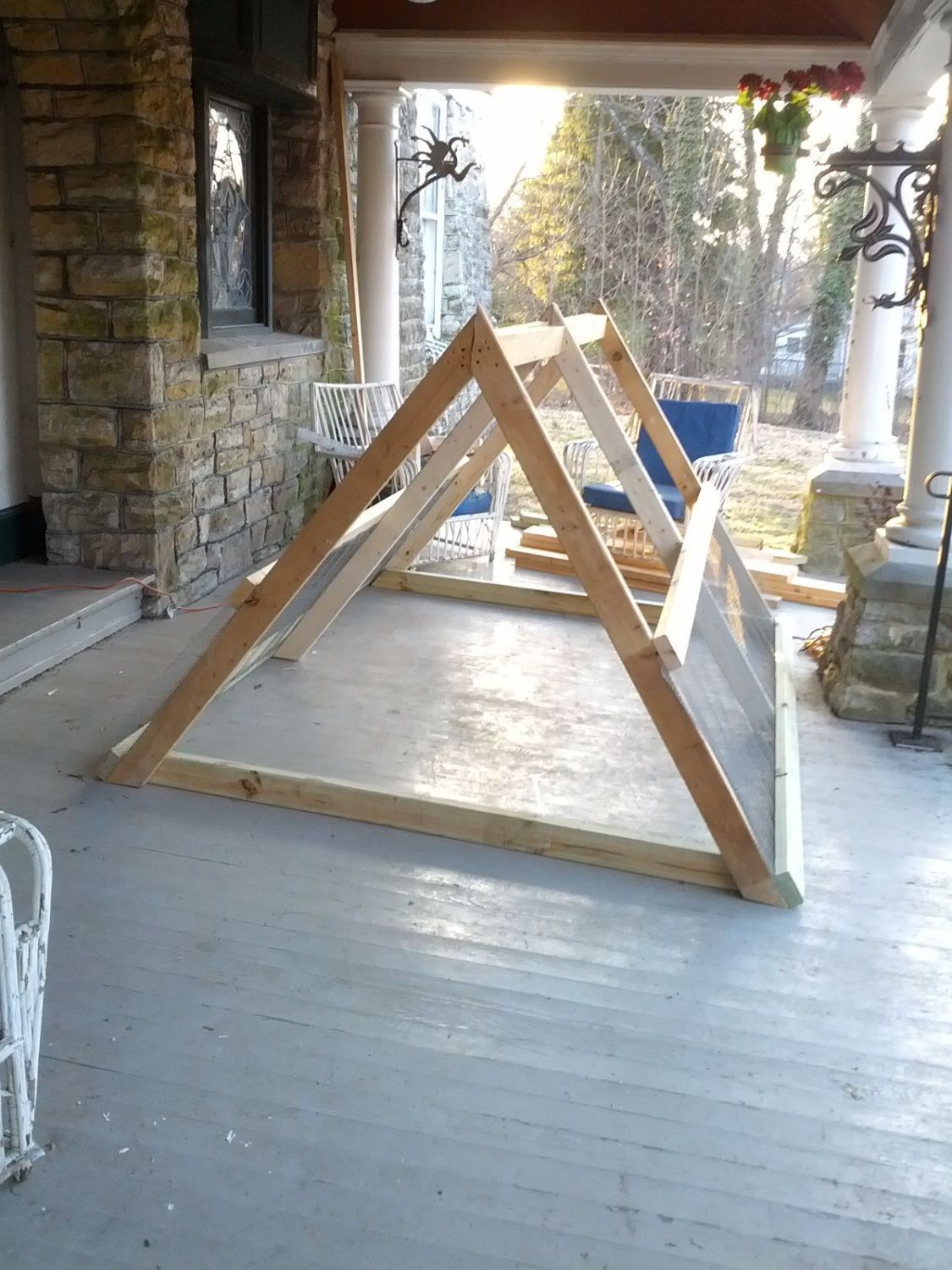 Make cuts. Paint pieces. Nail mesh between bottom 8' boards. Fasten this to your 3 truss pieces for each side.