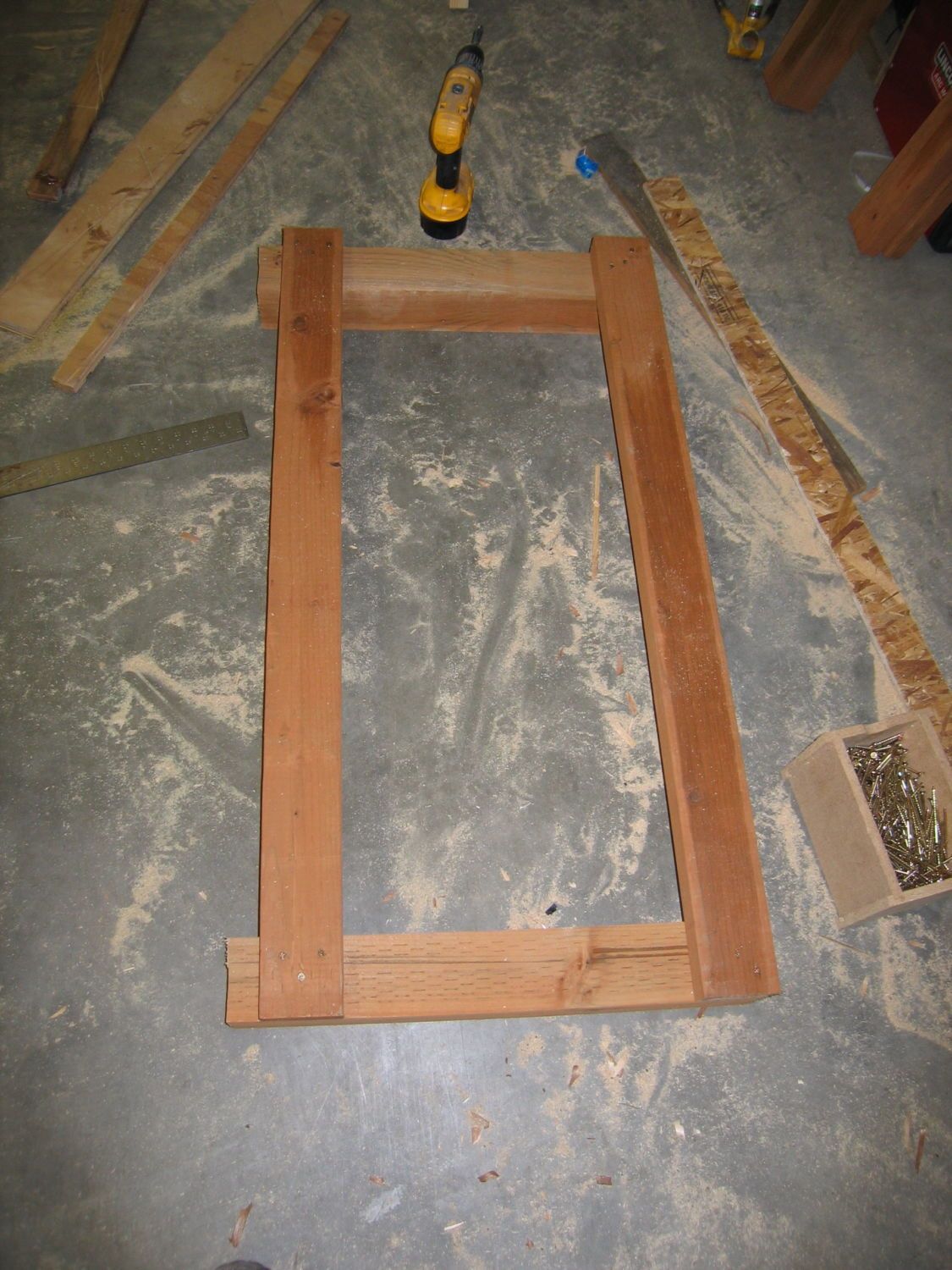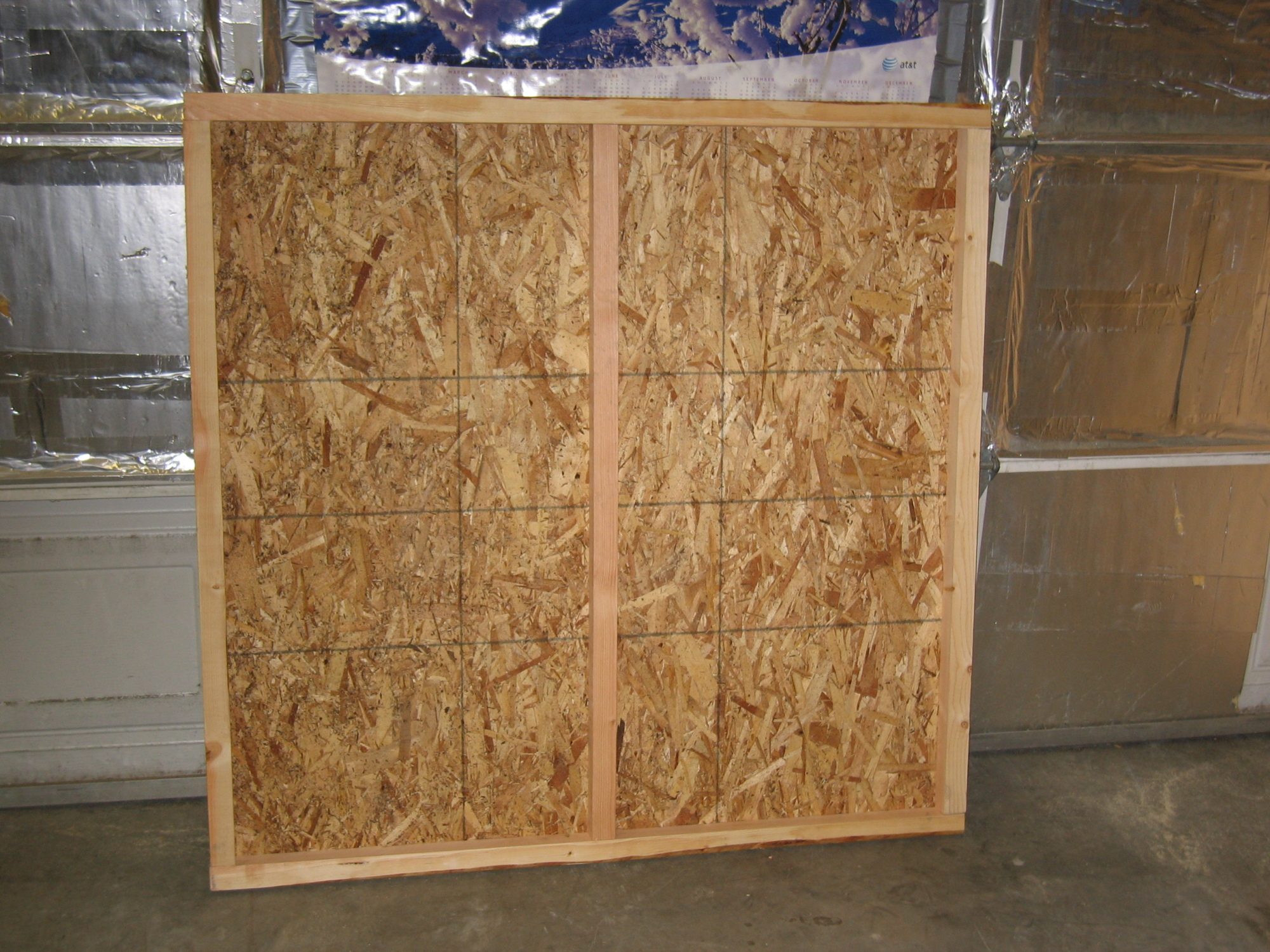 Lets get started, by cutting the OSB into a panel that is 47 1/4”X 45 5/8”. Then cut some 2x2’s down to size, you’ll need 2 at 45 5/8, and three at 44 7/16”. The two longer ones go along the sides with the same dimension, and the three smaller ones go between at the end of the panel and in the middle. Secure them with some screws through the OSB, and through the longer 2x2’s into the ends of the shorter ones. You may have to pre-drill those to keep from splitting the ends of the 2x2’s.