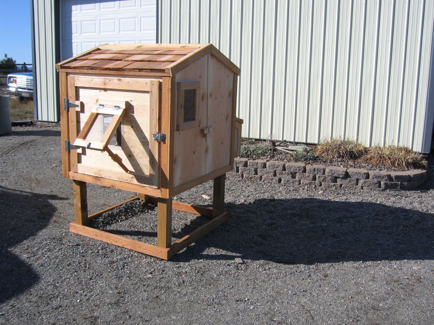 Several coop builds ago I got started trying to document the process from start to finish and my camera battery gave up the ghost. So with one of my last builds I took the time to make sure I got lotsa pictures and even took some notes. This is a 4'x4' coop with a lot of cedar so it will look ok in just about any backyard. Figure about 200-300 dollars for materials. You could save quite a bit by using something other than cedar, or even deleting most of the trim all together. This coop can be stretched to a 4x8 with very little in changes to the design, but I can't move 4x8's by myself so I don't build and sell those very often.