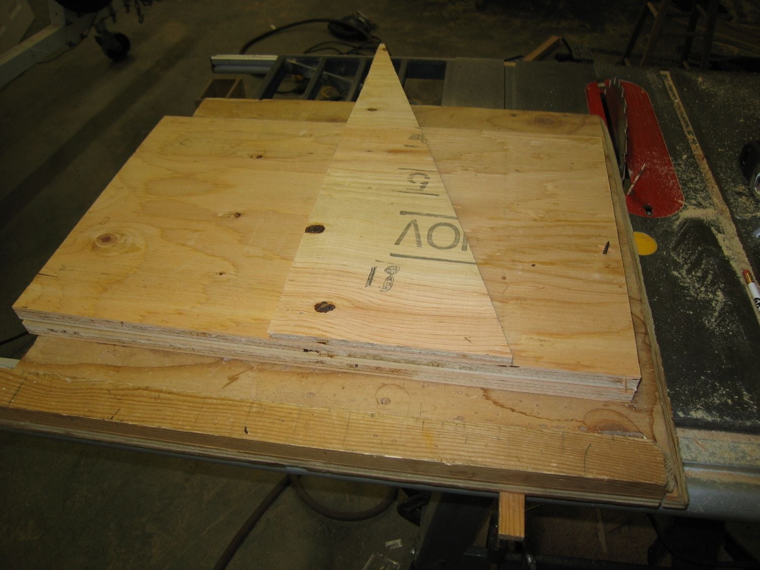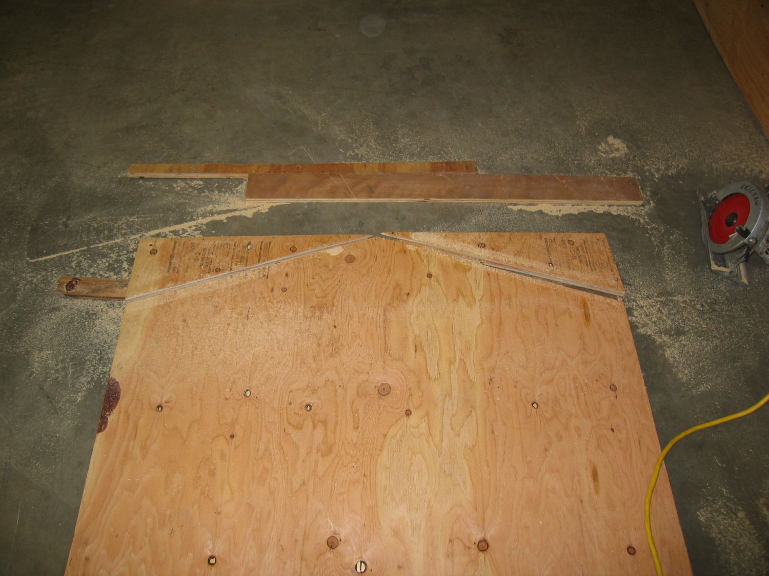 This is how I like to rip large panels by myself. Put some scrap down to either side of the Now take the panels and stack them so the three factory edges are all in alignment with the edge you just cut at the top. Once everything is aligned and to your satisfaction, drive a couple screws through both panels in the corners closest to the edge you just cut. Measure up from the bottom (factory) edge 40” and make a mark on both sides of the panel. Make a mark at the exact center of the top panel, and draw lines intersecting the three marks. Set your saw to a depth that will cut through both panels and cut the corners off. SAVE THE CORNER SCRAPS!