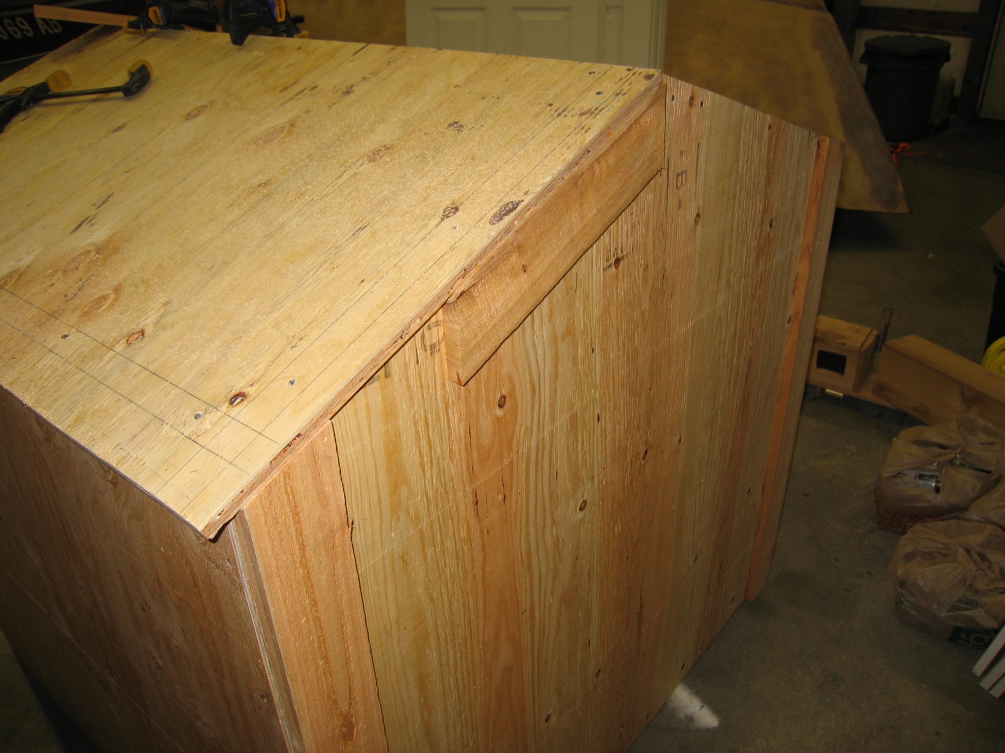 Cut an angle through ALL of the roof that matches the angle between the coop wall and the nest box, so that the nest box roof matches up as closely as possible. Again play with some scraps until you get it dead on.