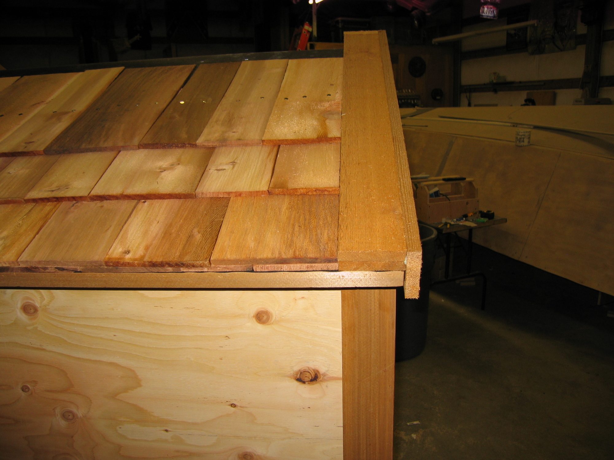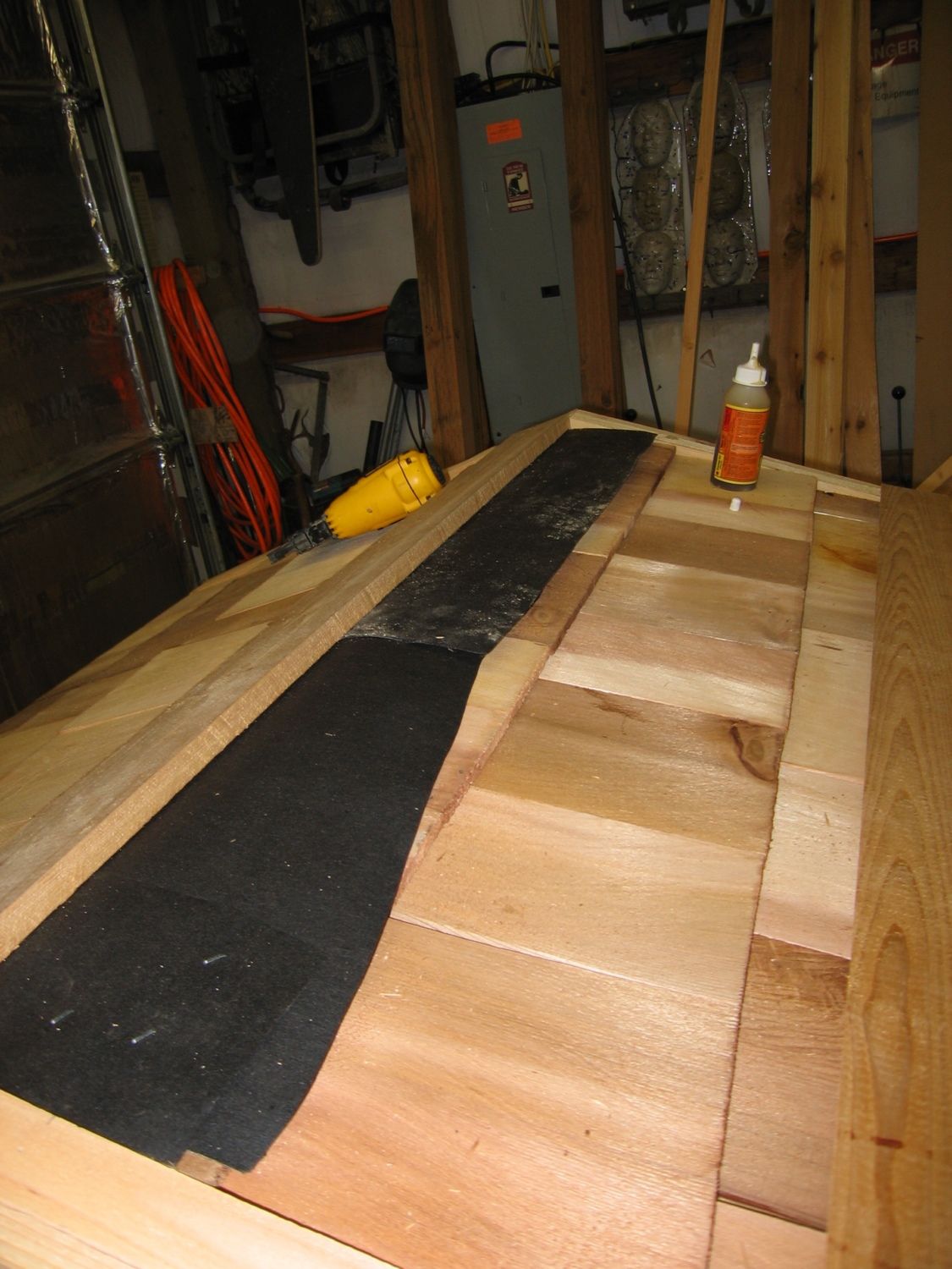 Cut the tar paper flush with the eave edge and start the build up on the gable end. Typically I use two layers of the 1x3 cedar ripped down to 1 1/2”. Secure these pieces with screws from the bottom of the roof panel going up. Where these pieces meet at the peak they will have to be mitered, play with some scraps until you get it just right, make sure you use a good exterior rated glue on that joint.