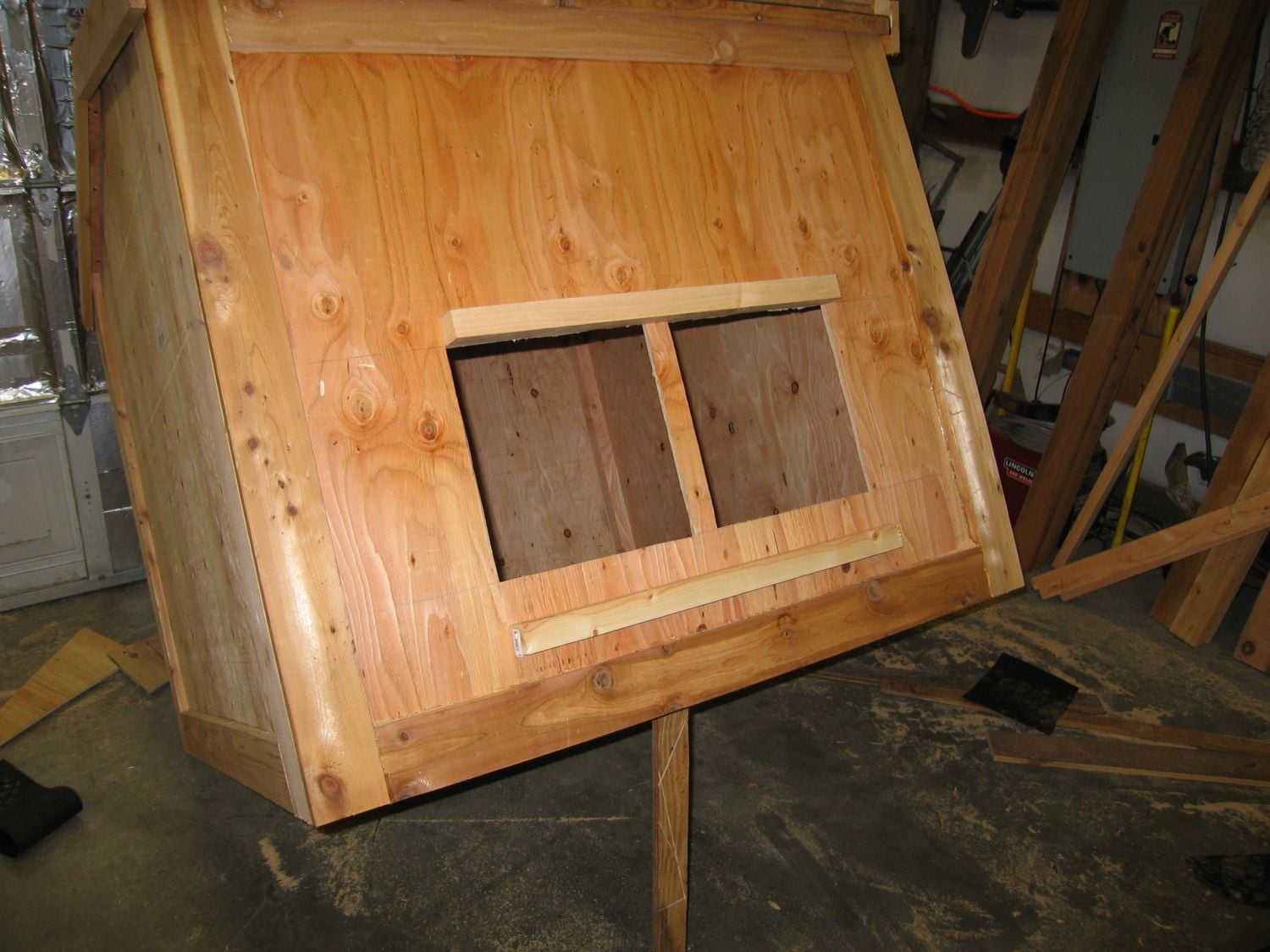 Take another scrap of the 3/4” plywood and cut it the same width as the upper and lower 2x2’s previously mounted to the coop for the nest box. Cut it to the same height as the low side of the end panels of the nest box. It should be right around 13 7/8 or so. Frame up around the perimeter of this panel with 2x2.