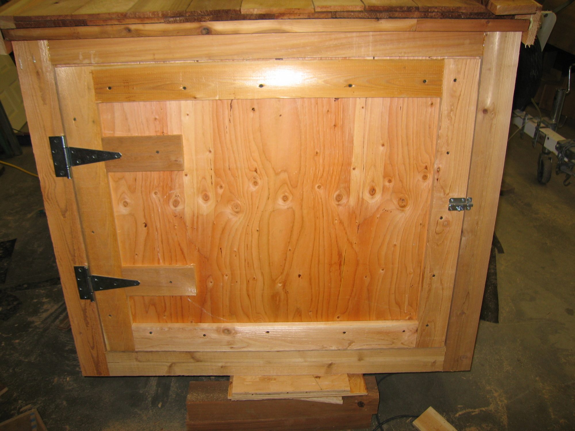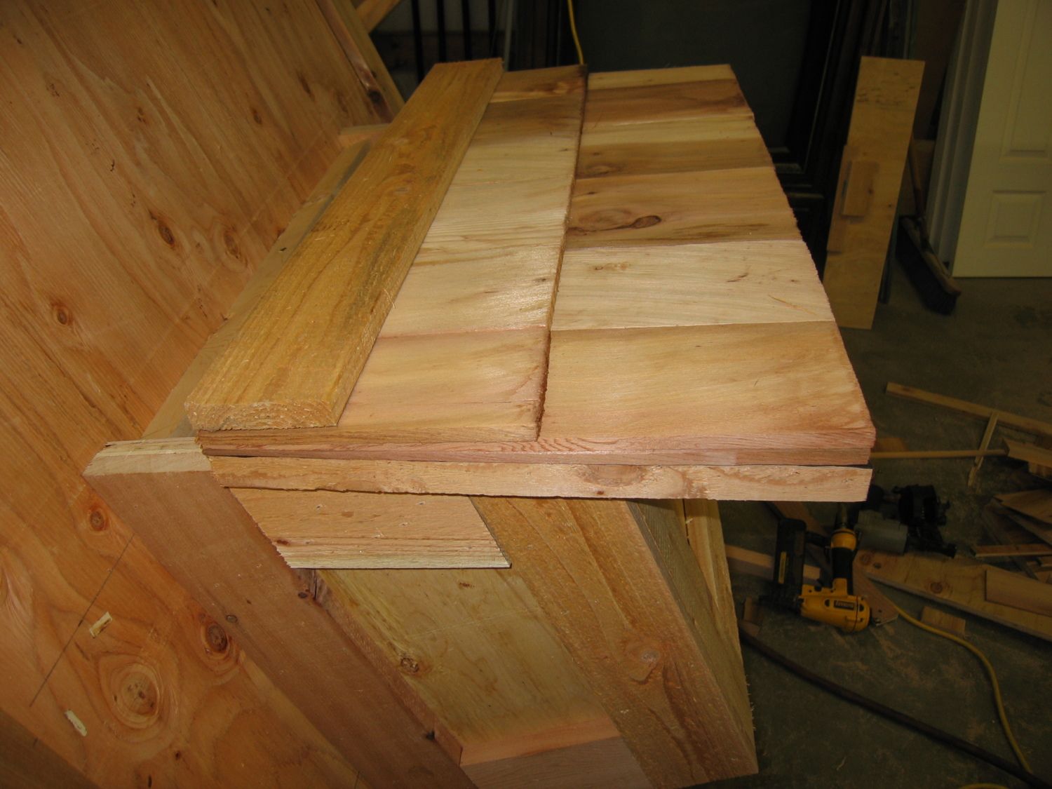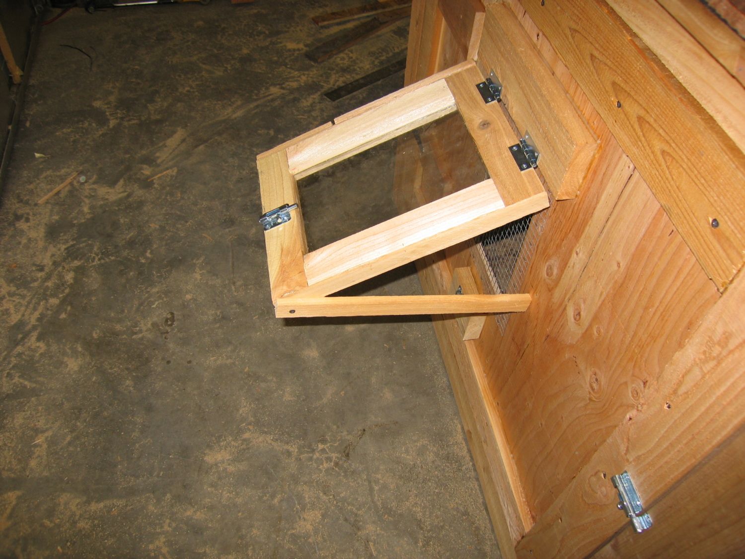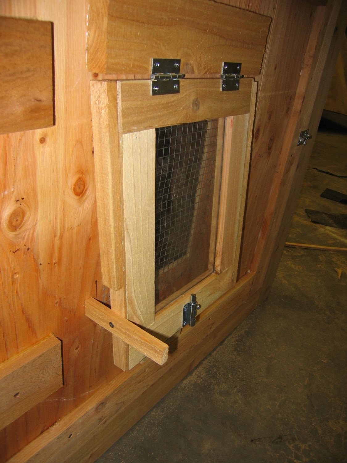 On the other side of the coop. Attach a couple small scraps of cedar and cut another piece for the handle.