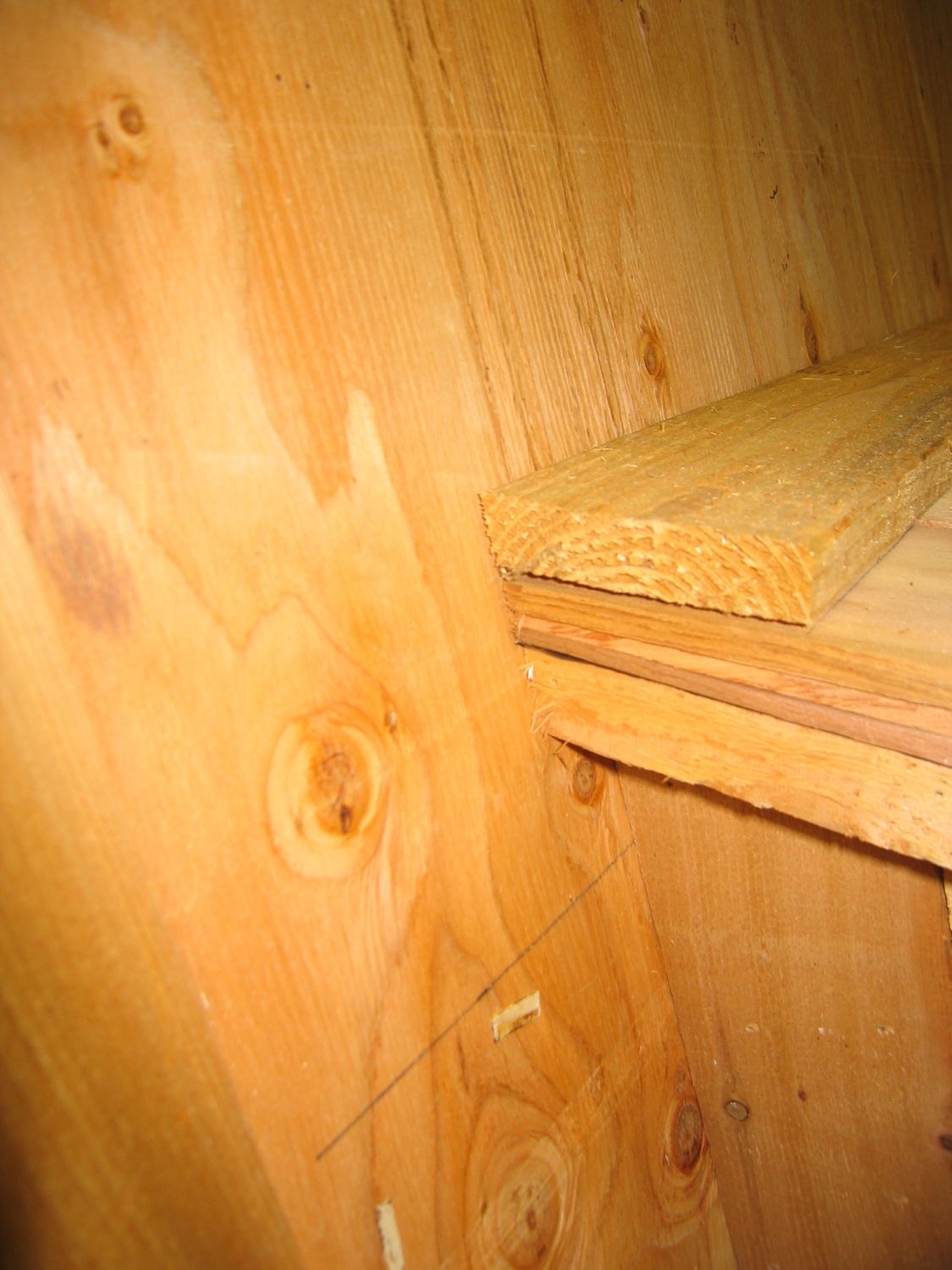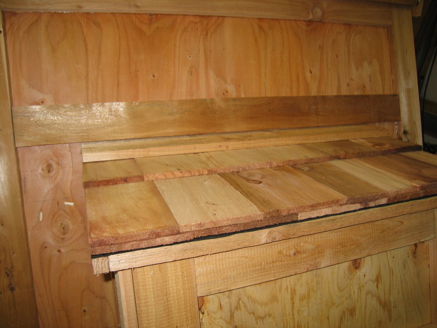 Cut a piece of 1x3 cedar so that it fits between the trim on the corners of the coop just above the nest box. Rip of an angle of about 45 degrees or so.