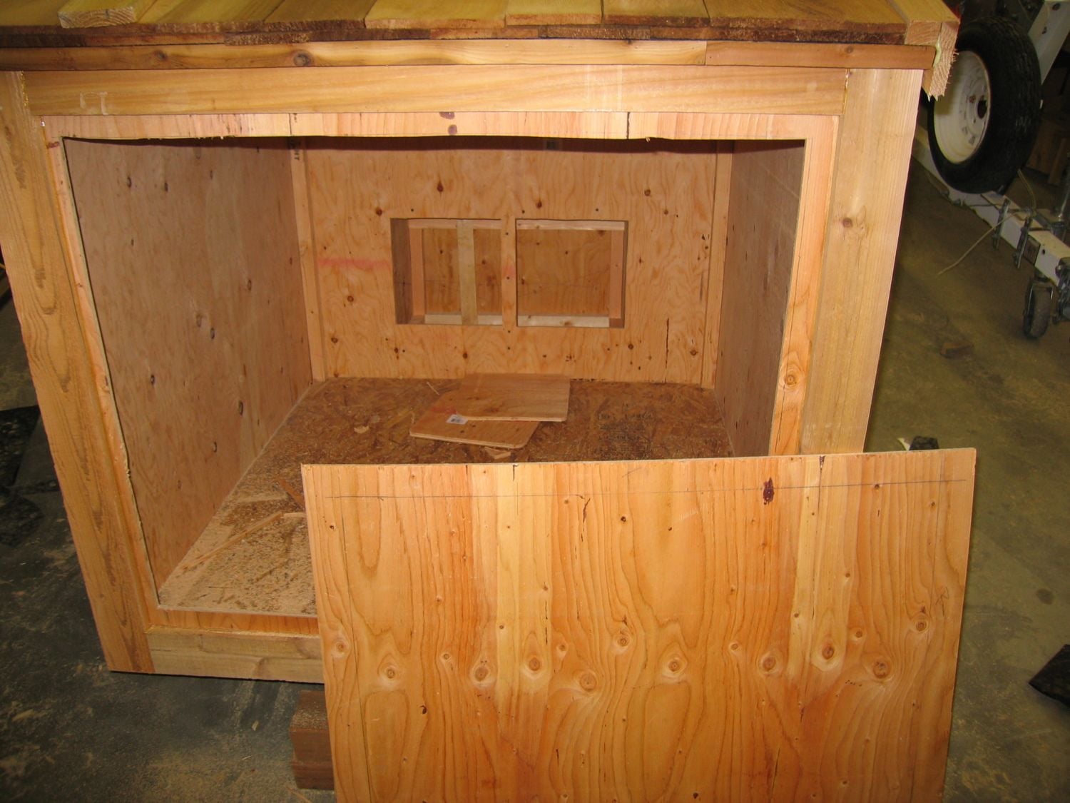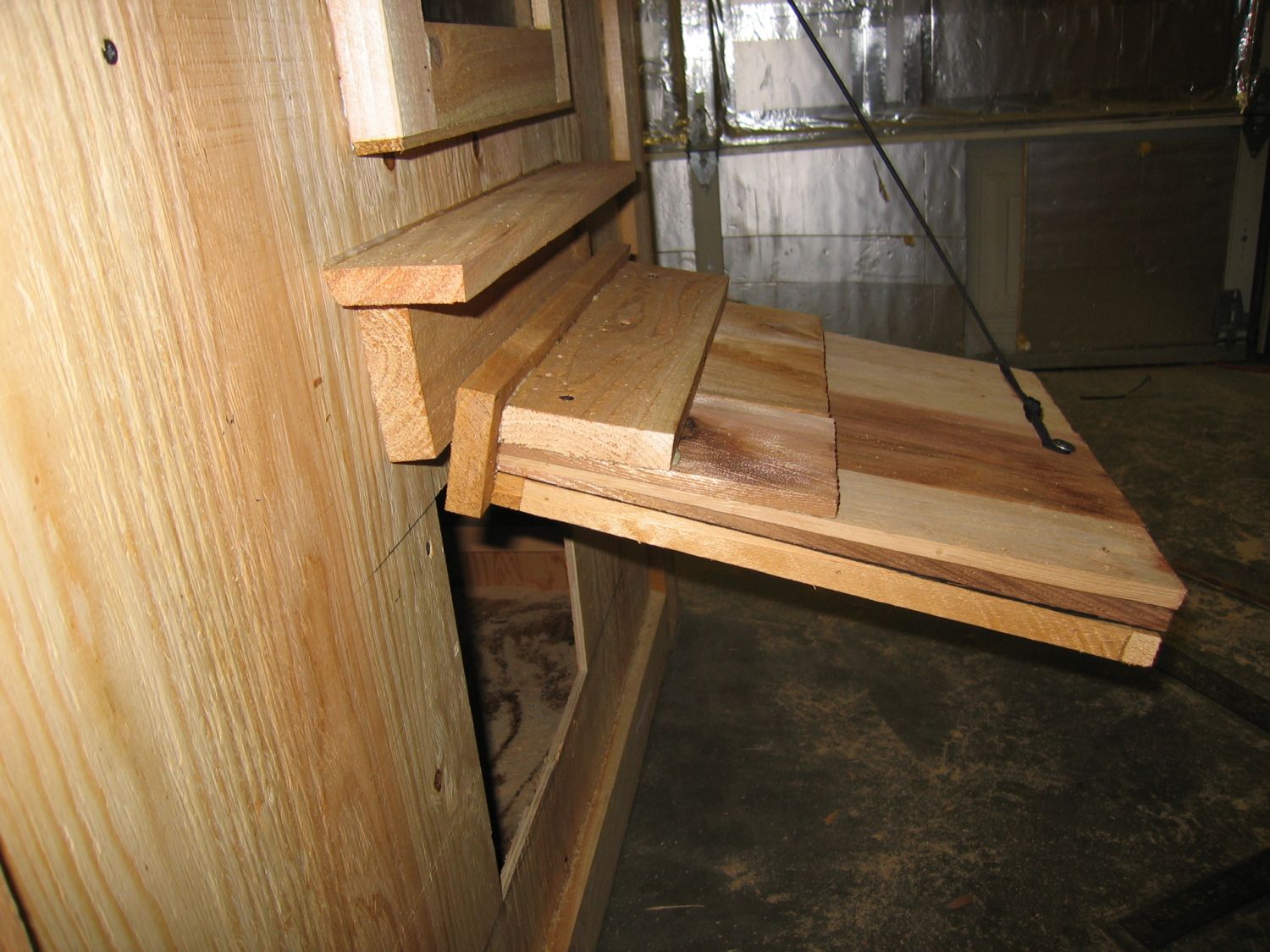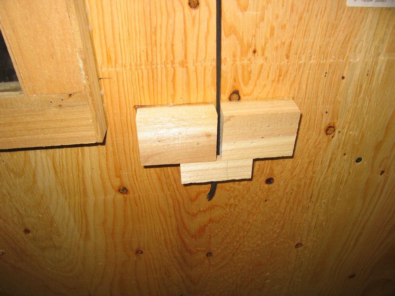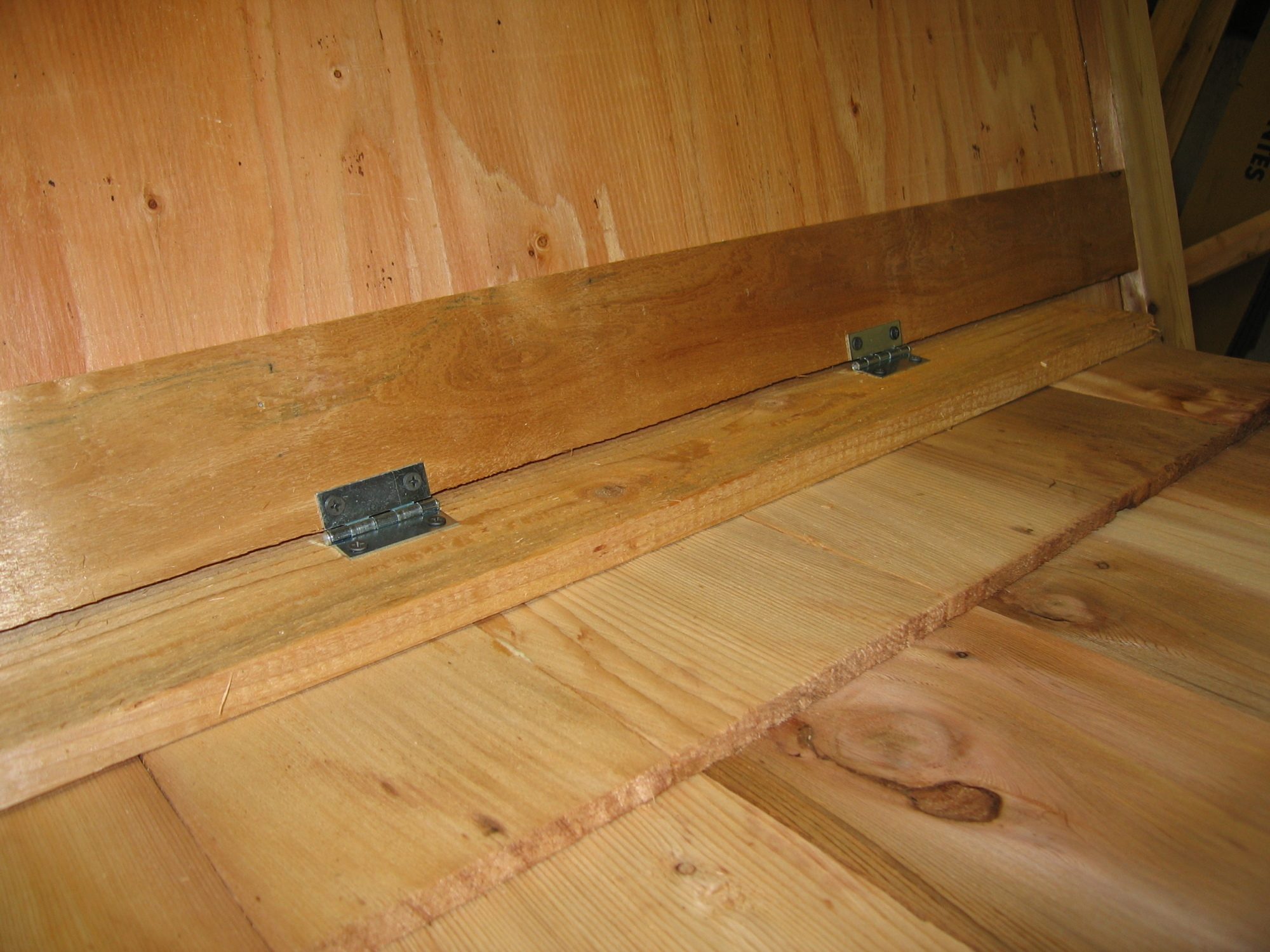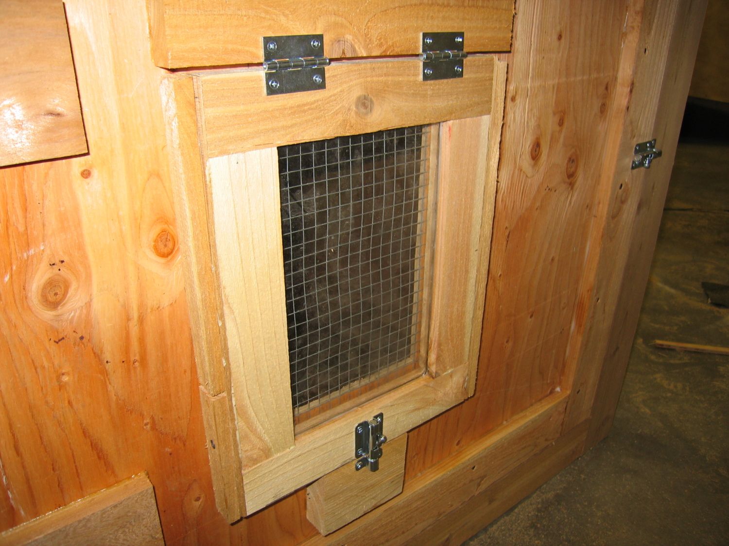 Cut a 12”x12” hole and just like the people door do it so you can reuse this piece. You may have to scrounge around and use some smaller scraps of 1/2” to get it thick enough to use. Trim out along the sides with some cedar and roof it. Attach it like so. You’ll want to keep the hinges as close to the back edge of the door as possible so that it closes under it’s own weight. Drill a hole through the gable ends and run a piece of string through to the other side. Secure it with a screw on the pop door.