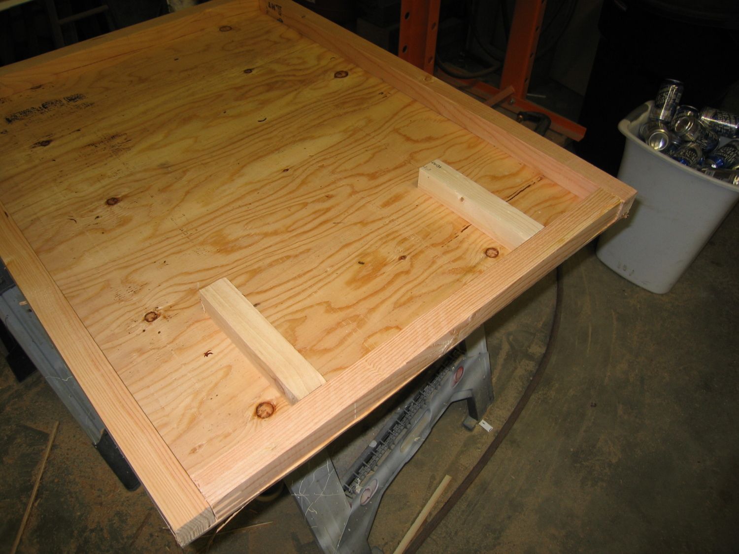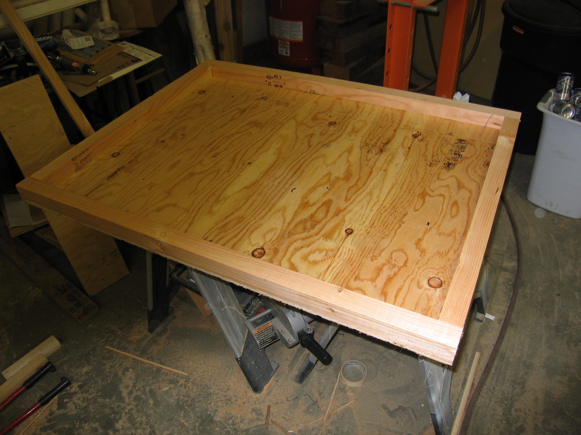 Once you have your panel cut out. Cut 1/2” off of all four sides so that you have better clearance with the coop side. This is best done with a table saw, but it can be done with a skill saw or even your jig saw. Then frame it up like so with 2x2’s.