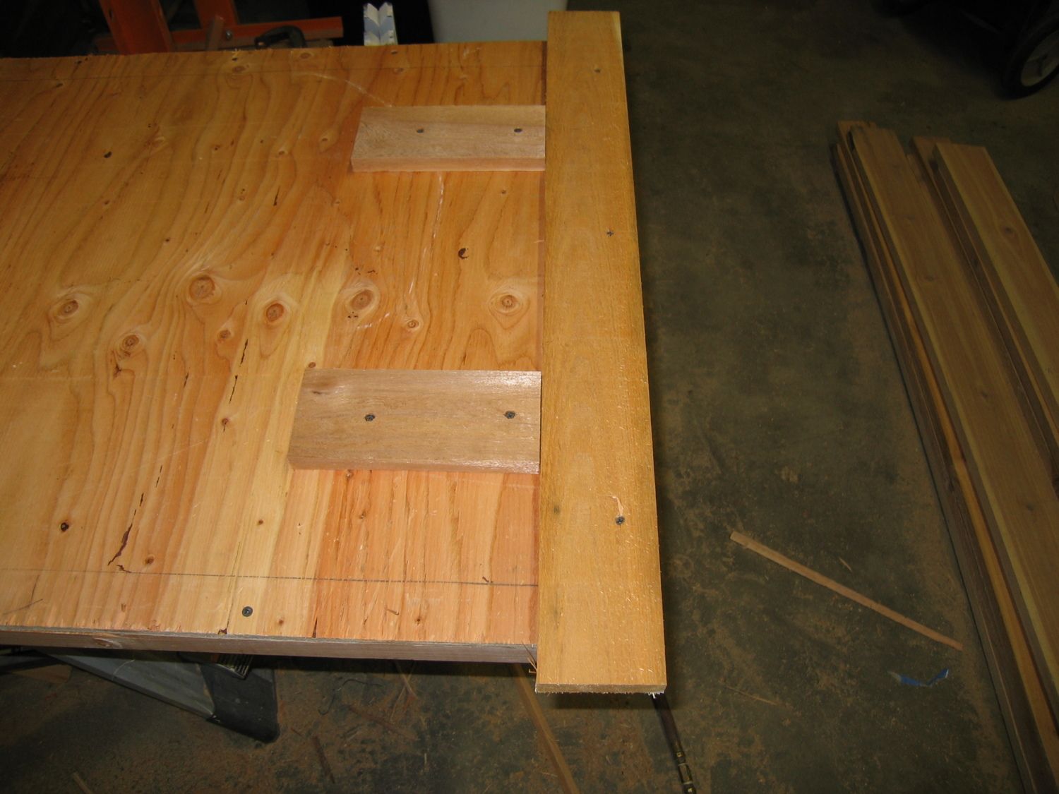 Same basic procedure for the side panels. Rip a sheet of the 1/2” plywood in half, align the factory edges put a couple screws into the parts your are going to cut off and make two panels that are 40” x 45 5/8”