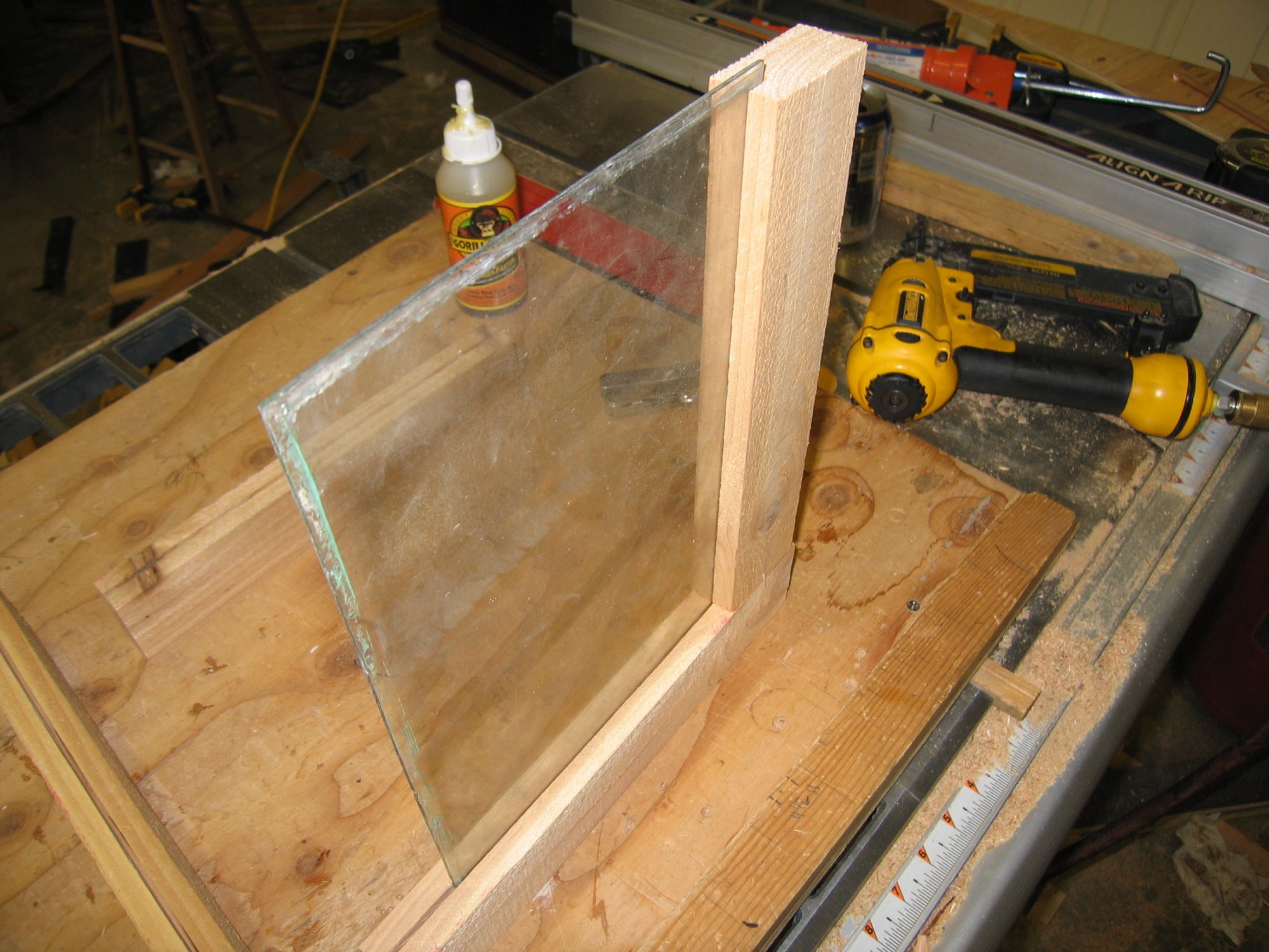 You have two choices here. You can either buy/scrounge some windows or, you can make your own. I tend to make my own because I’m cheap that way. I got some glass out of some old single pane windows that I scored off of Craigslist for free. They measured just about 8x12” which is perfect. To start with you’ll need to cut a kerf down the bits that actually make up the window frame. One pass should be just about perfect.