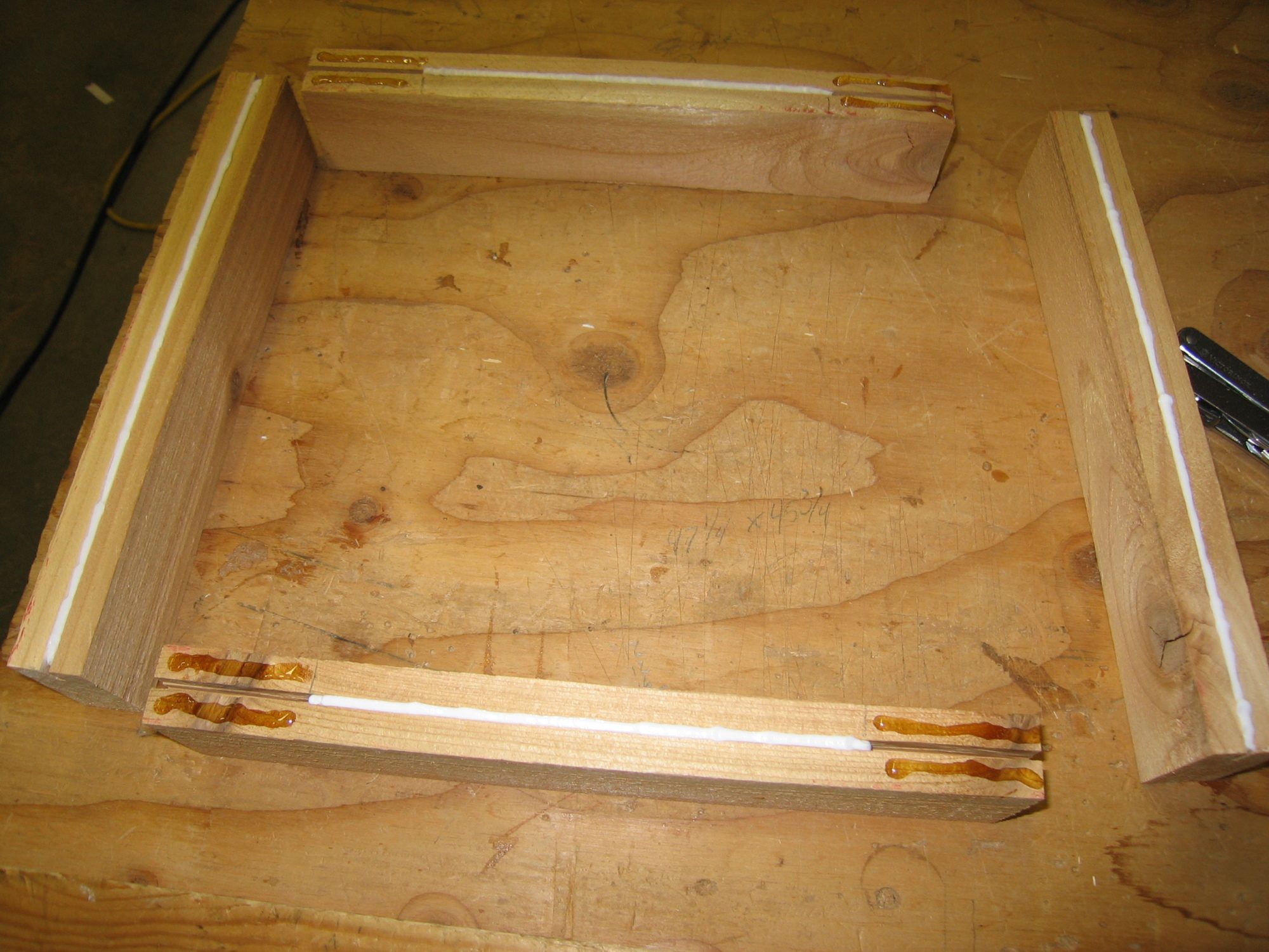 Once you are happy with the fit, put some good quality clear caulk in the kerf being careful to keep it out of the area where you are going to be applying the glue. Apply the glue on the top and bottom panels and start assembly.