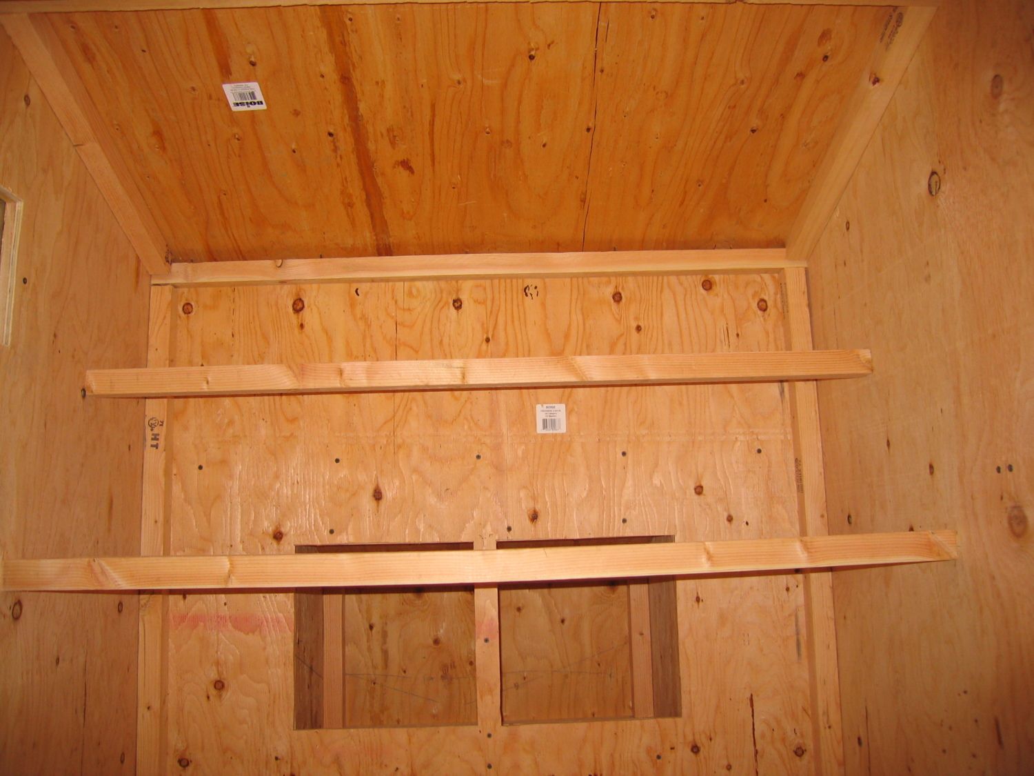 Roost Bars are the last of the 2x2’s we’re going to need. Cut them to length and attach them with screws from the outside of the coop into their ends. If they are rolling at all, drive a finish nail in from outside to stop that.