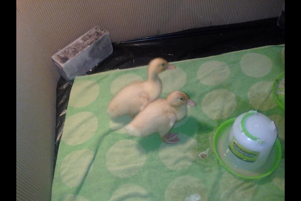 Last weekend, my sister, her boyfriend, and I went to Tractor Supply to buy ducks. We ended up bringing home two little babies. The whole way home they were in their cardboard carrying box, chirping and runnning around like crazy. When we got back to the house I took them to the backyard and started playing with them. It didn't take long to see how strongly attached to each other they were. As soon as I picked one of them up, the other one would chirp and spin in a circle, looking for his lost buddy. Once I put down the squirming little chick, the two would start chasing each other again, I played with them in the yard for a while, and then took them inside to Darrell's (my sister's boyfriend) room, where they will be living until they are bigger, so they don't get eaten by hawks. They are in a pen in Darrell's room, where they have toys to play with and occaisonally a little bit of water to splash in. Once they get to be ten weeks old, they will get their " grown-up " feathers, start swimming, and will probably be moved outside. Hope you enjoy the picture.