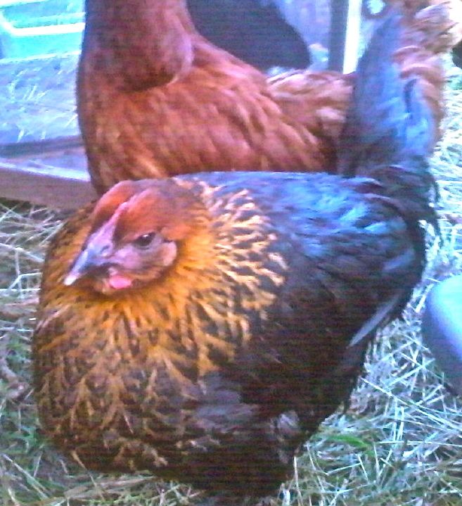 On the left,1st mate, Cluxanna Poy-o, a Brown Red OEG/Cochin Bantam cross with Captain Jean Roost Pickyard, a Brahma/Silkie Cross on the right.
