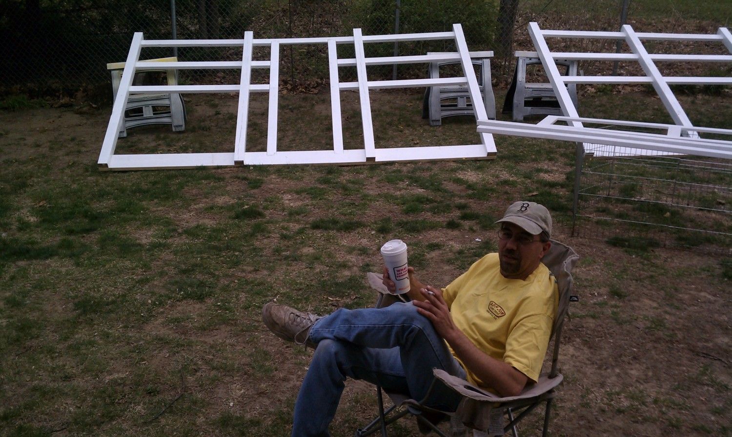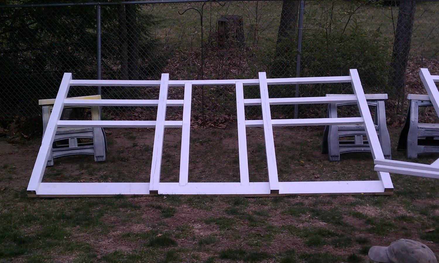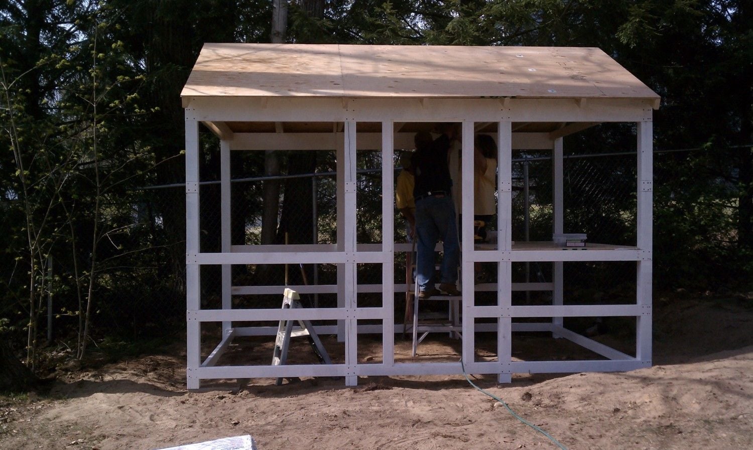 My uncle made the windows out of 1x stock and plexiglass -saved us a bit of money. There are the three windows you see below, along with a drop down vent on the back that is about 6 inches x 3 feet long that is just the T111 and drops down on hinges.