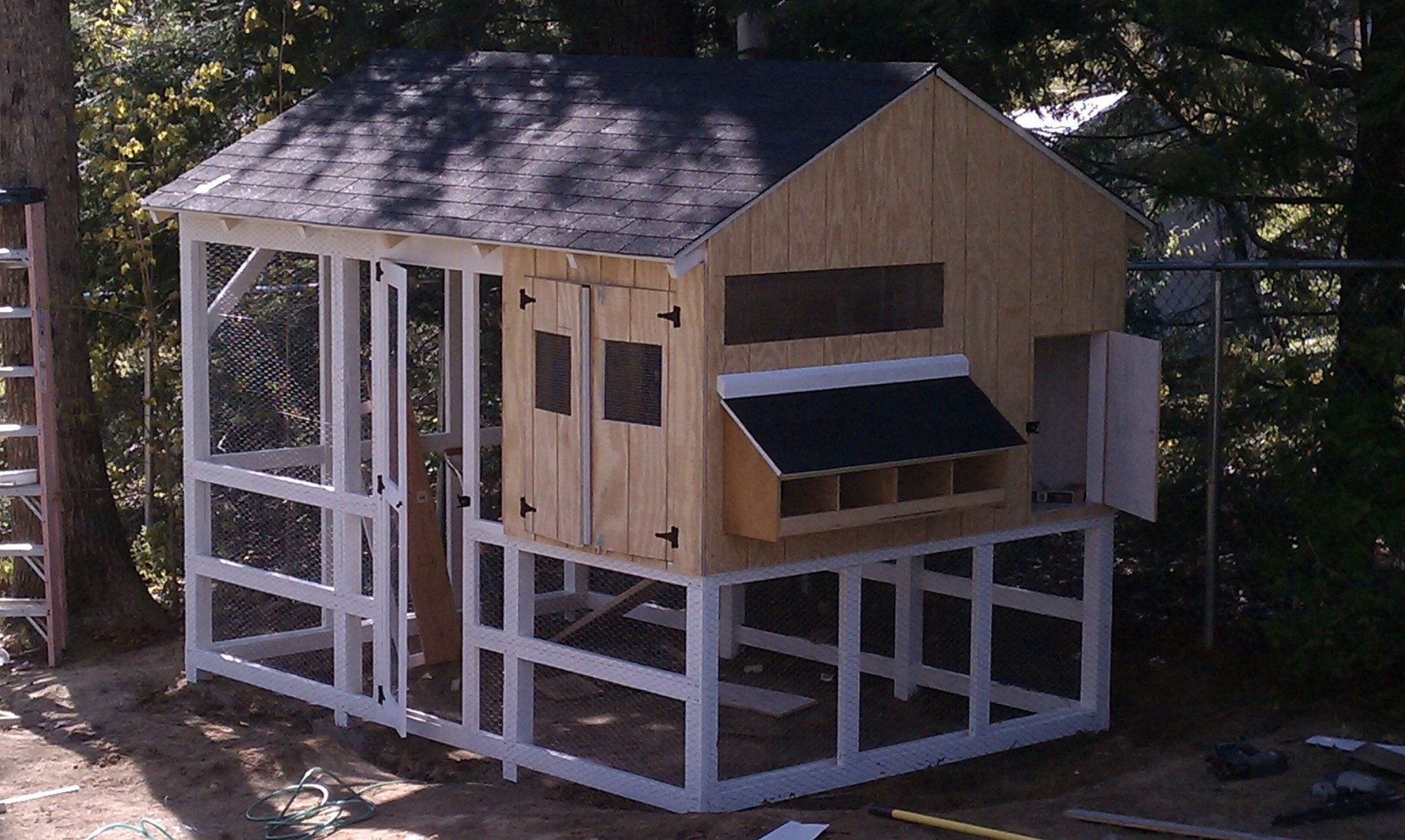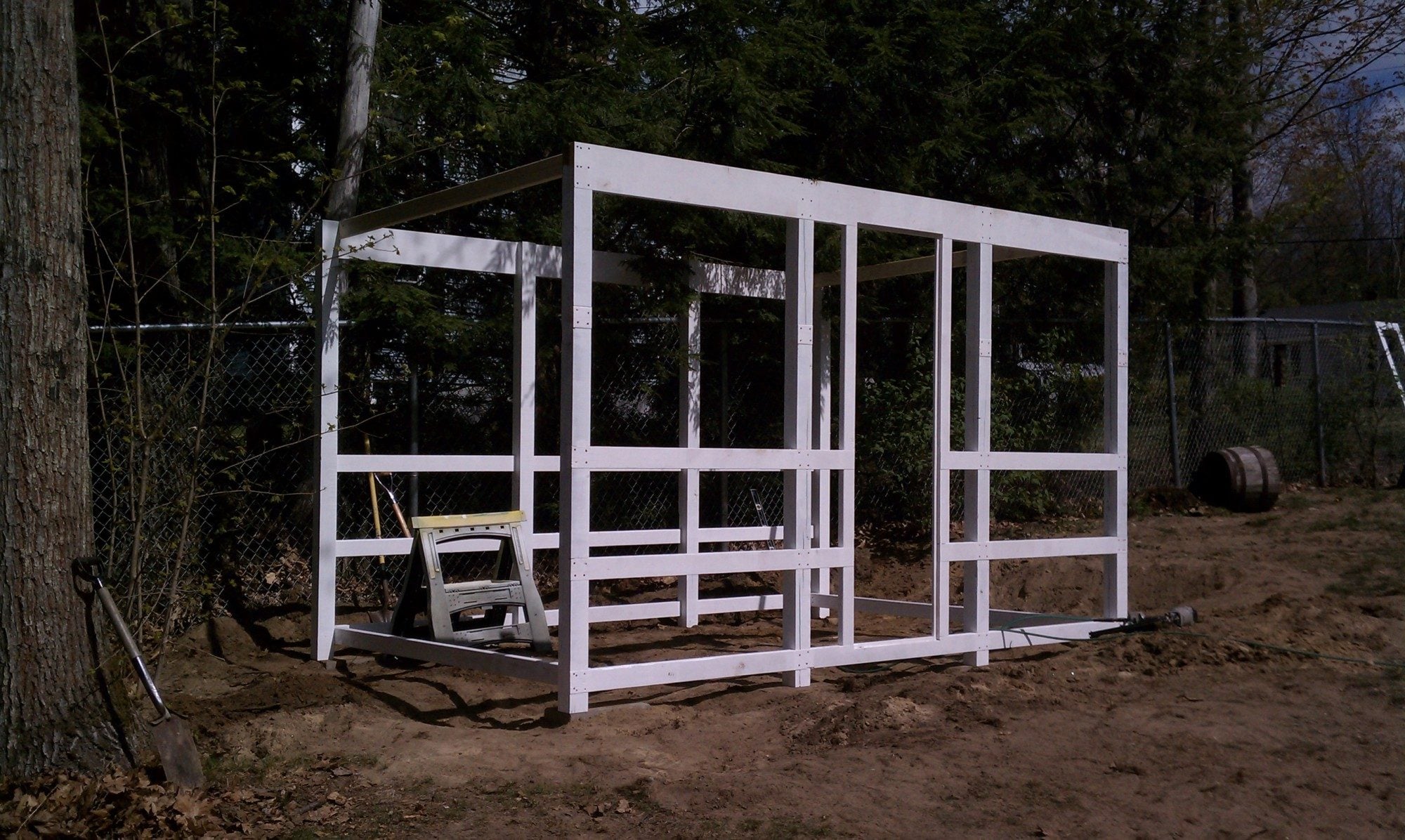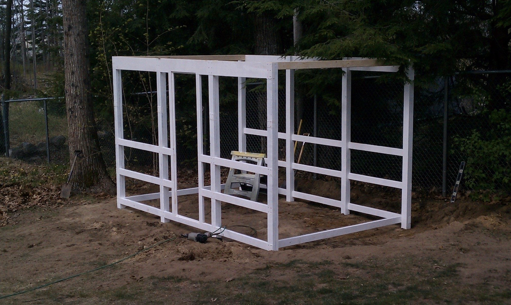 After pouring over what seemed to be a million designs and changing my mind 12 times, my uncle decided enough was enough, after all, the chicks were about 6 weeks old and my husband wanted them out of the house. We decided on a box design with the built in run. the structure is 8x12 with the coop part 4x8, with a 2x2 section in the back blocked off for a storage area.