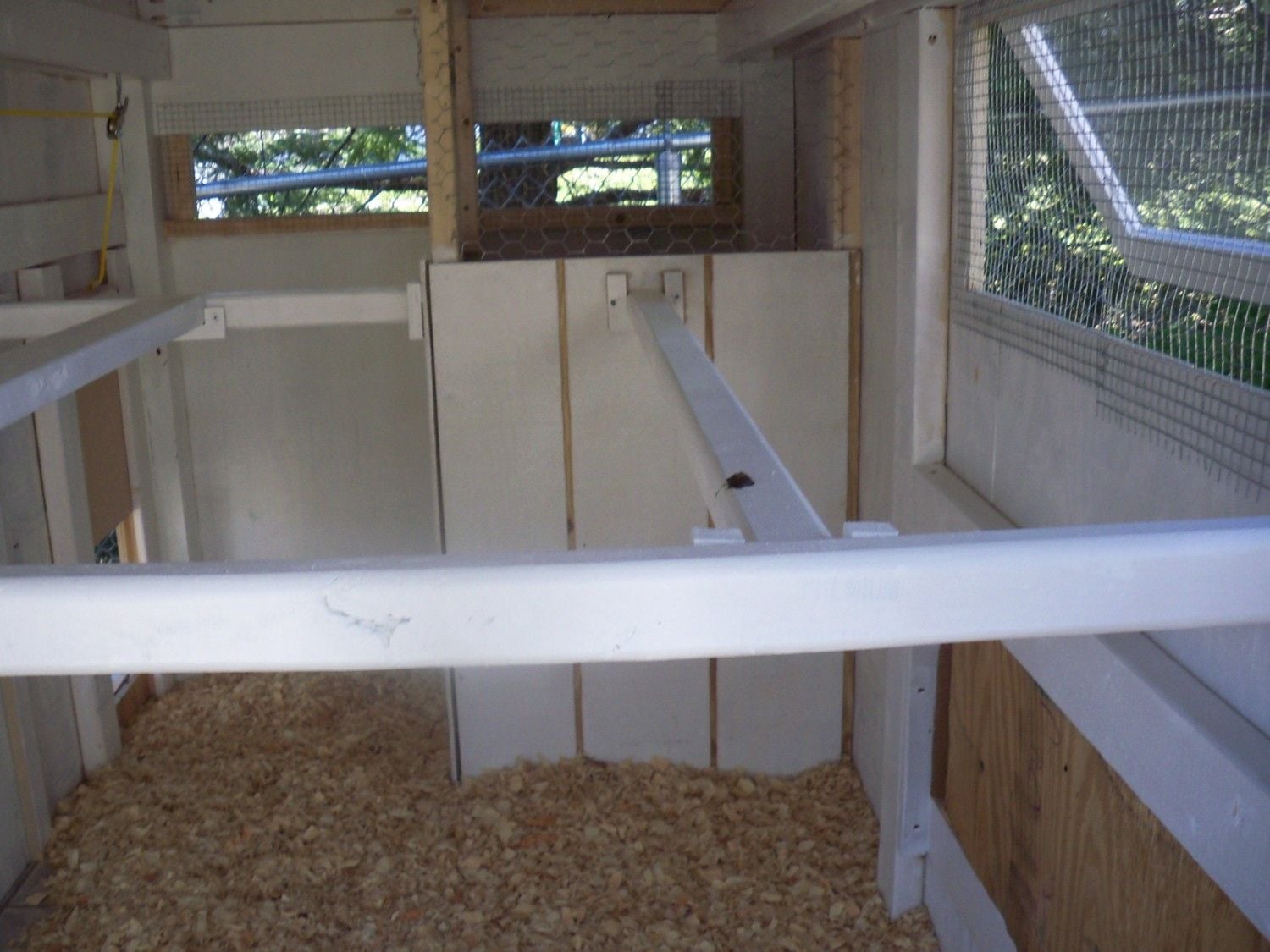 My cousin put in the perches. 3 smaller rounded 2x2s and a flat 2x4 for the chilly nights and cold feet. you can see the storage area on the right hand side and the Martha Stewart interior striped "wallpaper". The nesting boxes are blocked off for now.