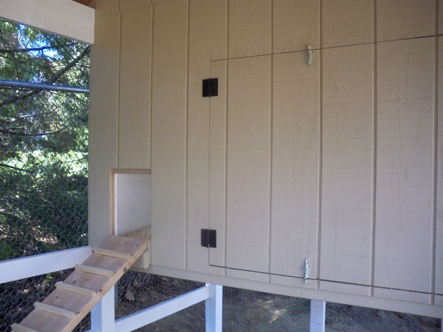 chicken door is on a pulley system. we added another cleat to hold the rope when the door is down to take up the slack of the rope inside