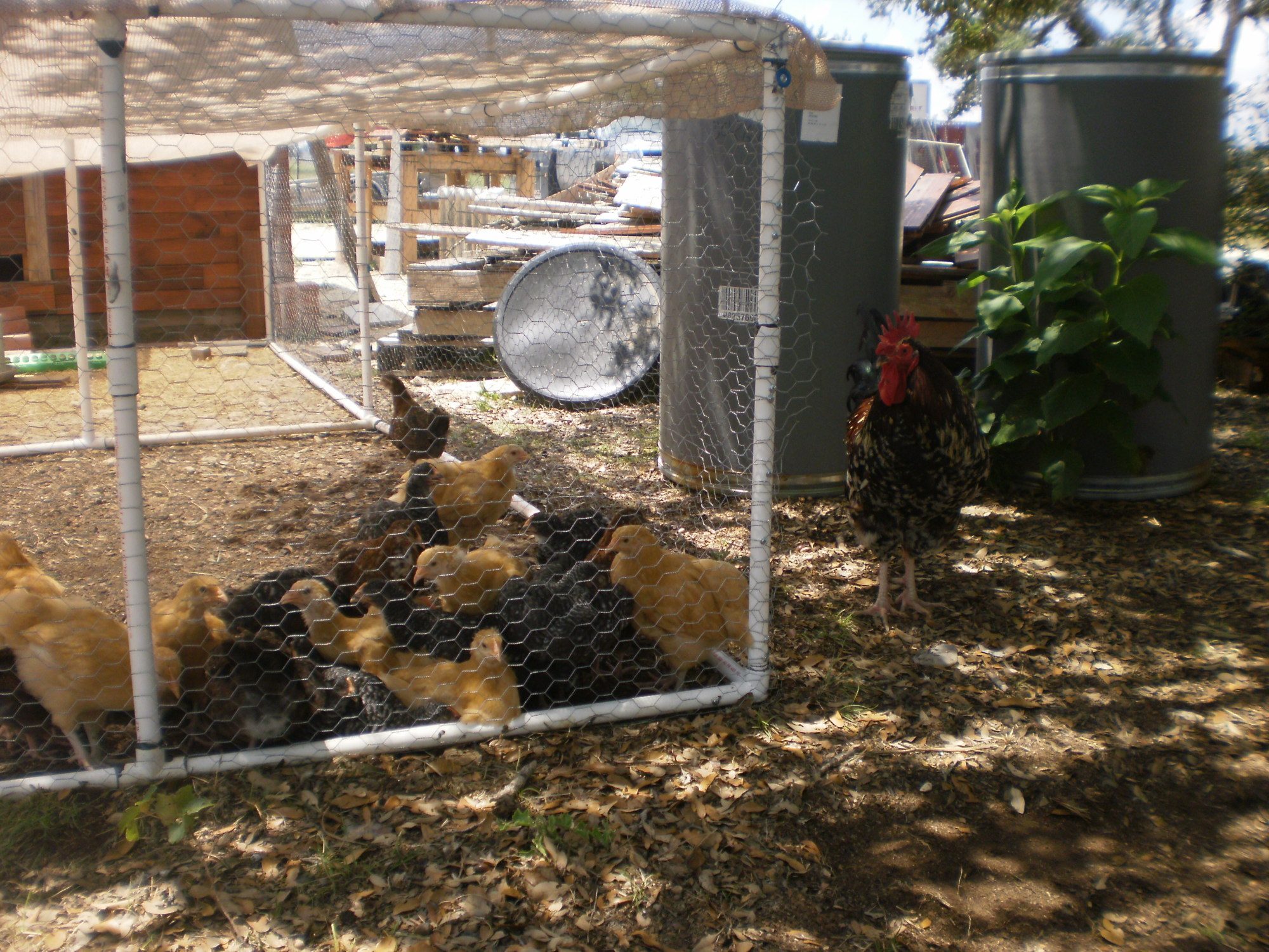 We recently added a chicken run made from PVC pipe, chicken wire , and gardening mesh over the top. We ordered 10 Barred Rocks, 10 Buff Orpingtons, and 5 Speckled Sussex chicks. They are a little over a month old now.