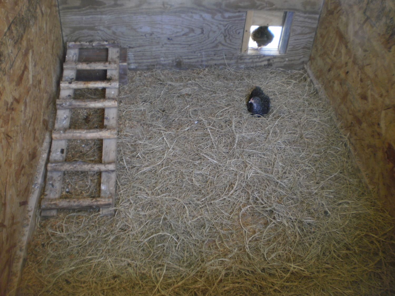 The inside of the coop. We added a roost for the the chicks too, even though most of them sleep on the ground. Looks like someone is taking a break inside.
