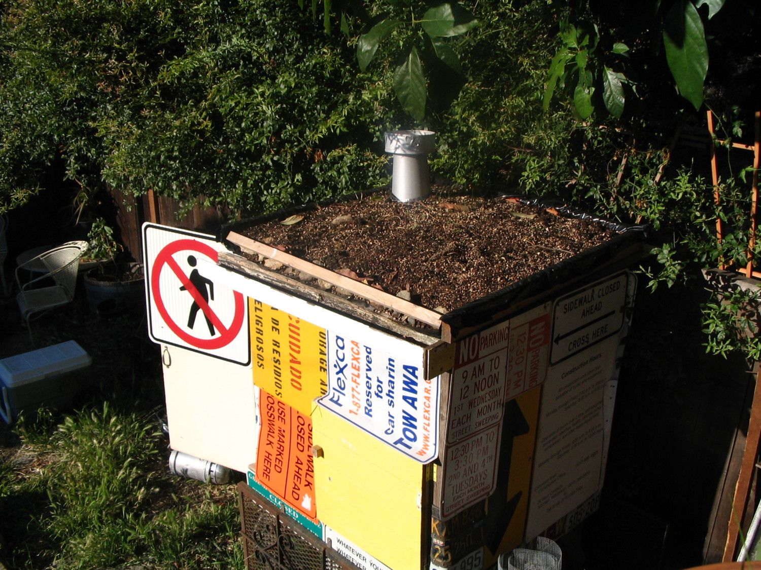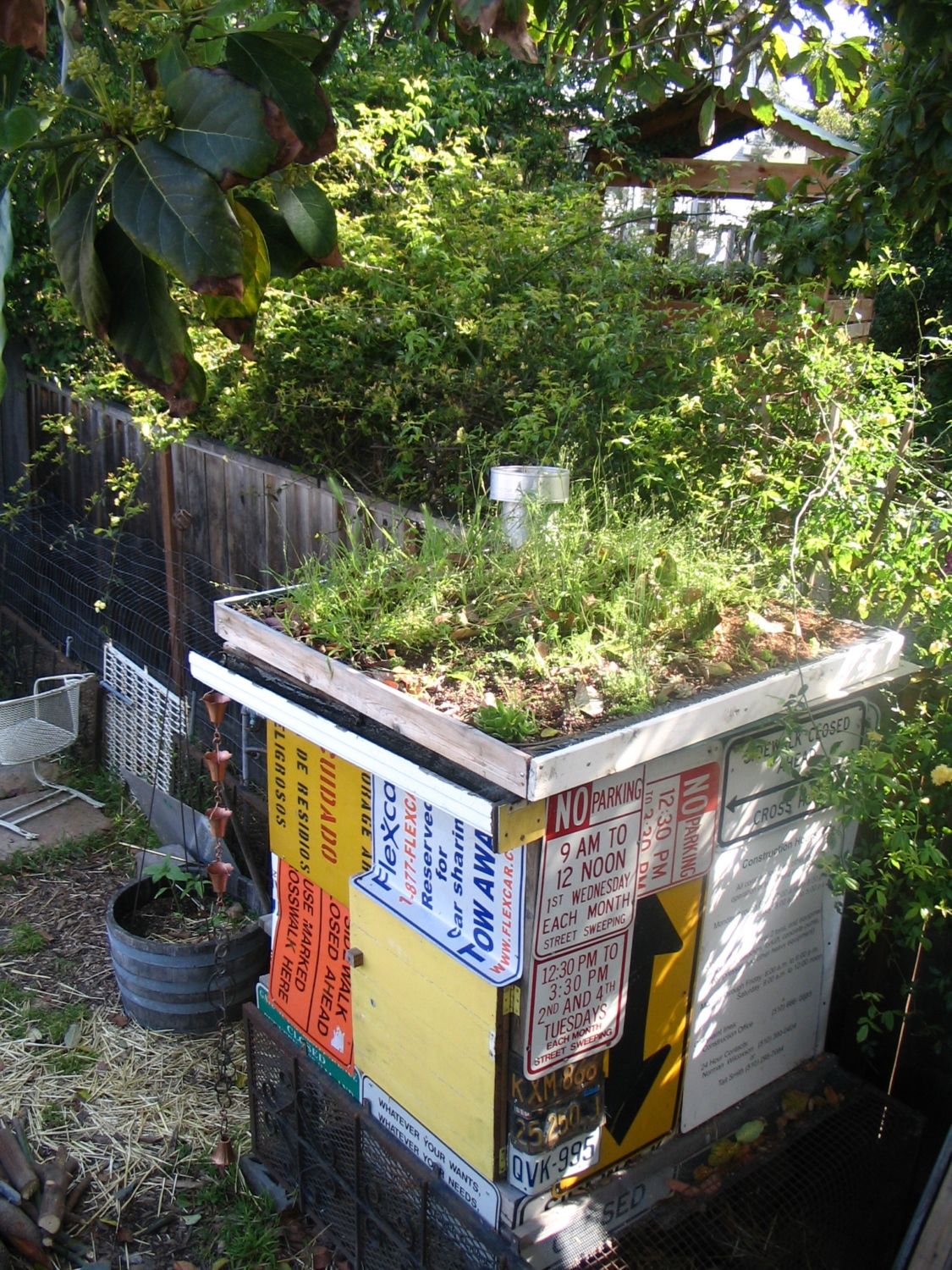 after i installed the metal roof, i got concerned about internal heat (i did install vents all along the roof eaves) so i decided to go "green". i sealed the roof with Henry's and installed a plastic liner. the roof slope is at 2% (i know, not enough, but i wanted a cube). i used a planting mixture of 1/2 coir, 1/4 pumas, and 1/4 compost. initially used a wildflower mix, but have slowly been replacing with succulents and sedums (the wildflower mix looked pretty rough in late summer).