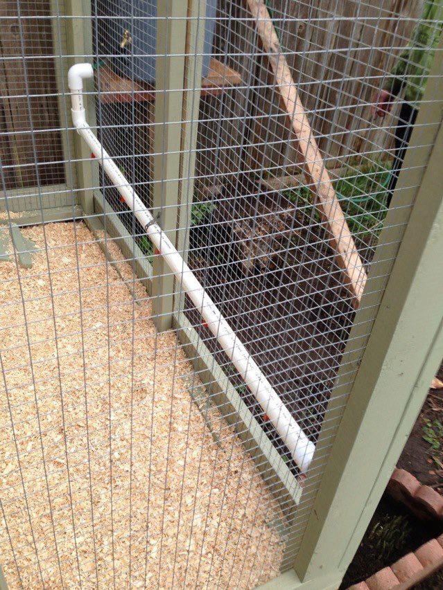 Close-up of the Auto-Water system for the chickens, just took some PVC piping and tapped it for the feeder nipples then ran it into a rainwater-return system we built.