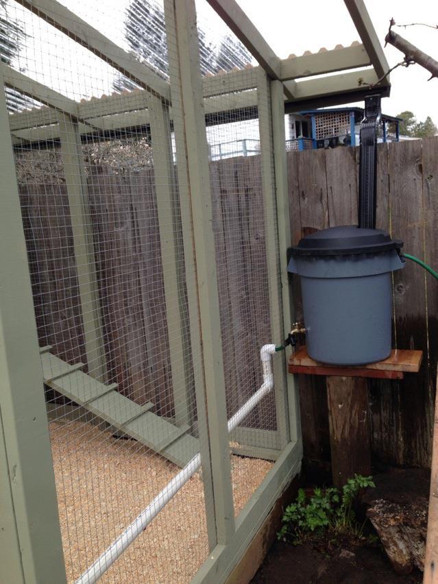 Rainwater return system is incorporated into the auto-watering for chickens to make sure they've always got water.