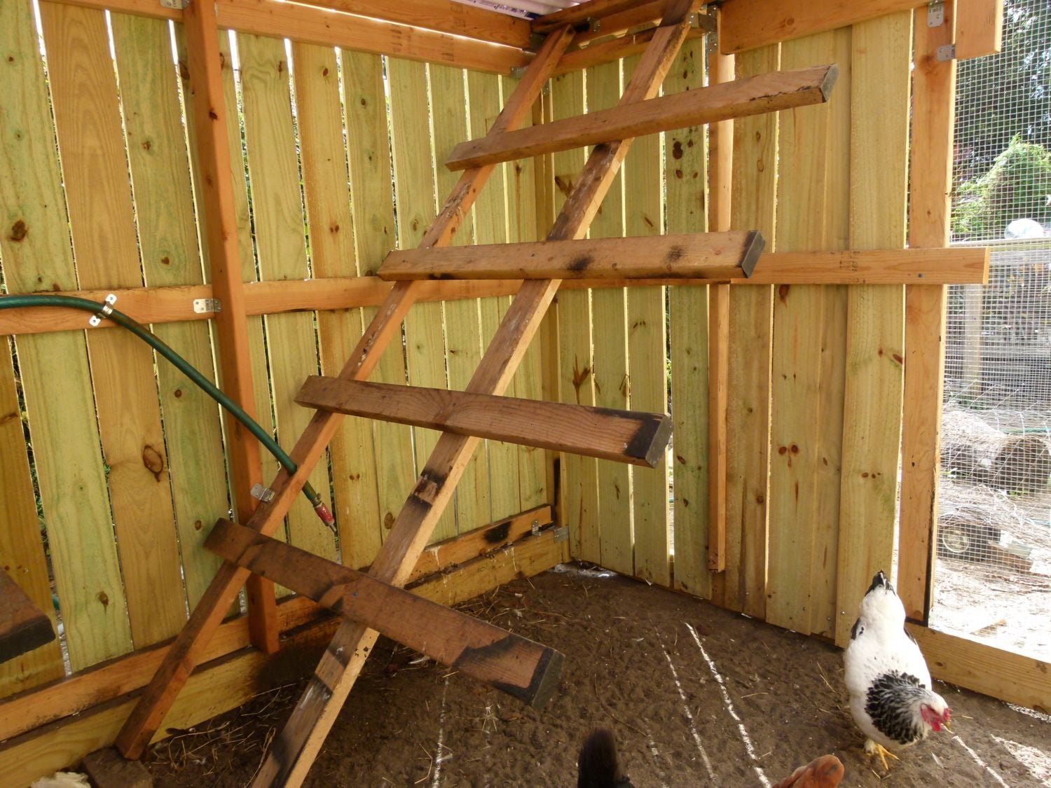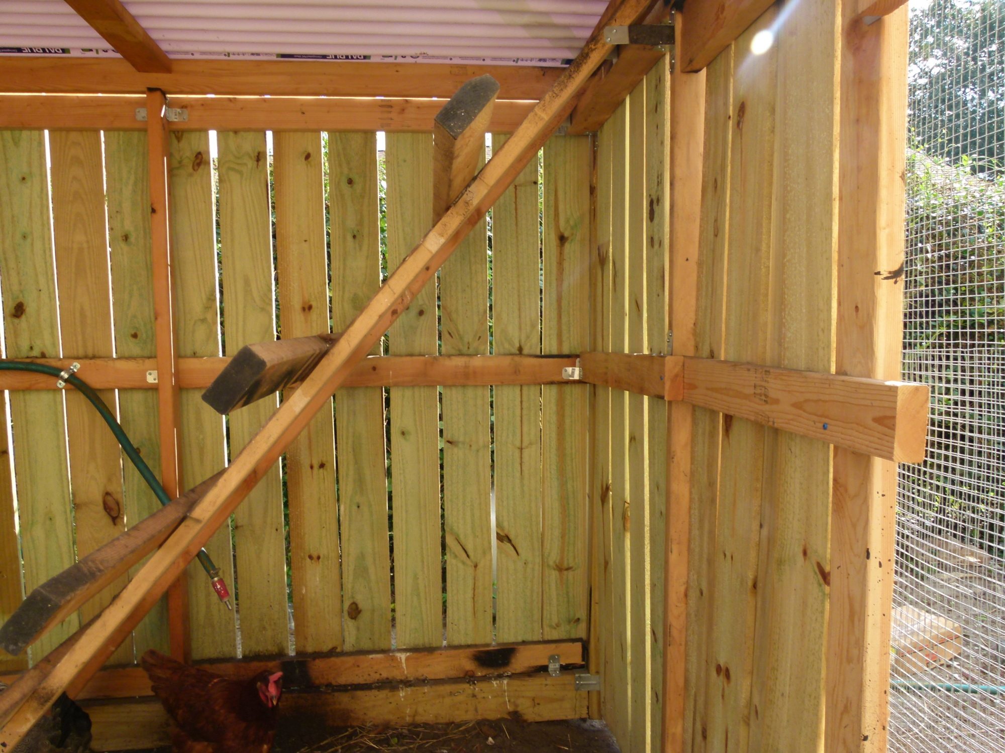 -On the half side of the coop we put pressure treated fencing material on all three walls where the nesting box is and the roost.